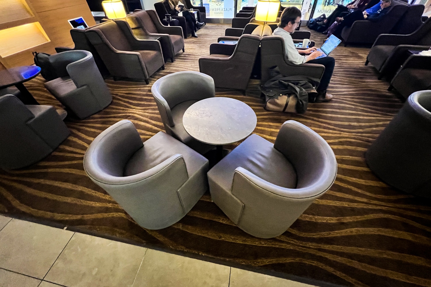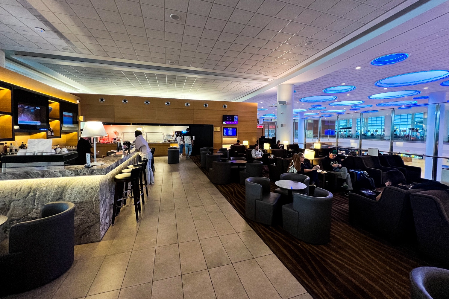 The lounge’s décor boasts a classic Plaza Premium aesthetic, with a range of brown hues and other warm tones. The open-concept lounge has several seating options scattered throughout, and can accommodate up to 100 guests.