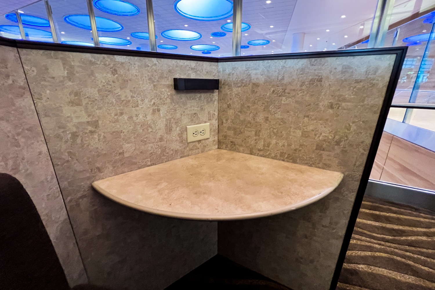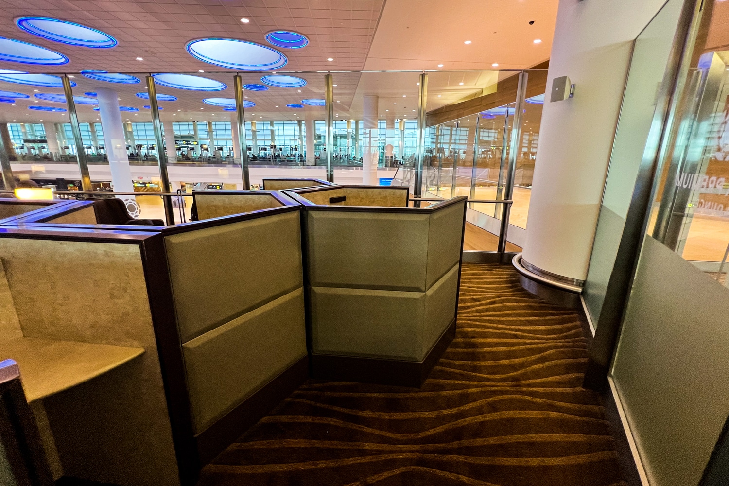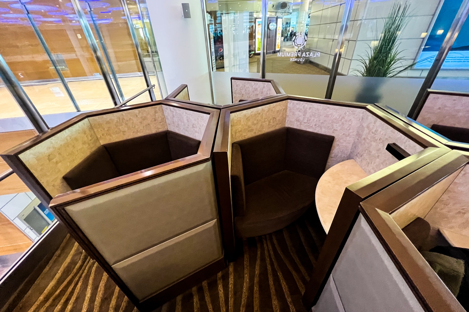 A cluster of hexagonal nooks is just past these tables, which is a feature seen at many other Plaza Premium Lounges. Nestled inside are soft brown seats and a small desk fitted with charging ports and a reading light.
