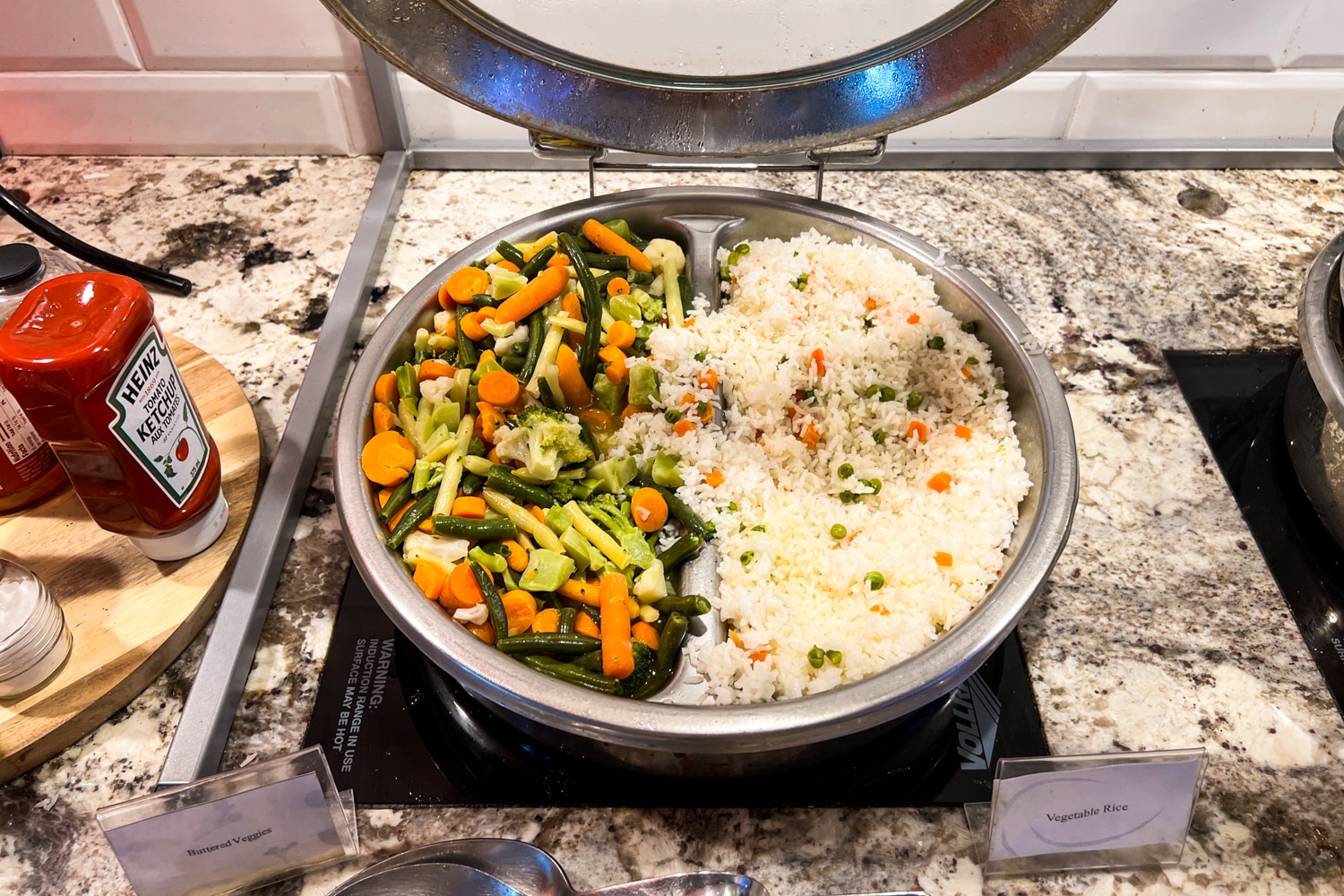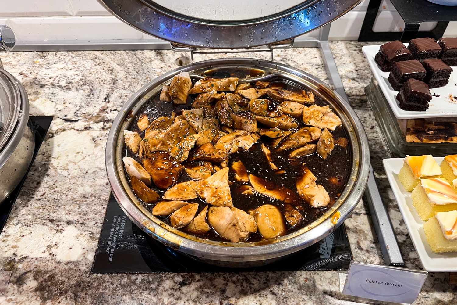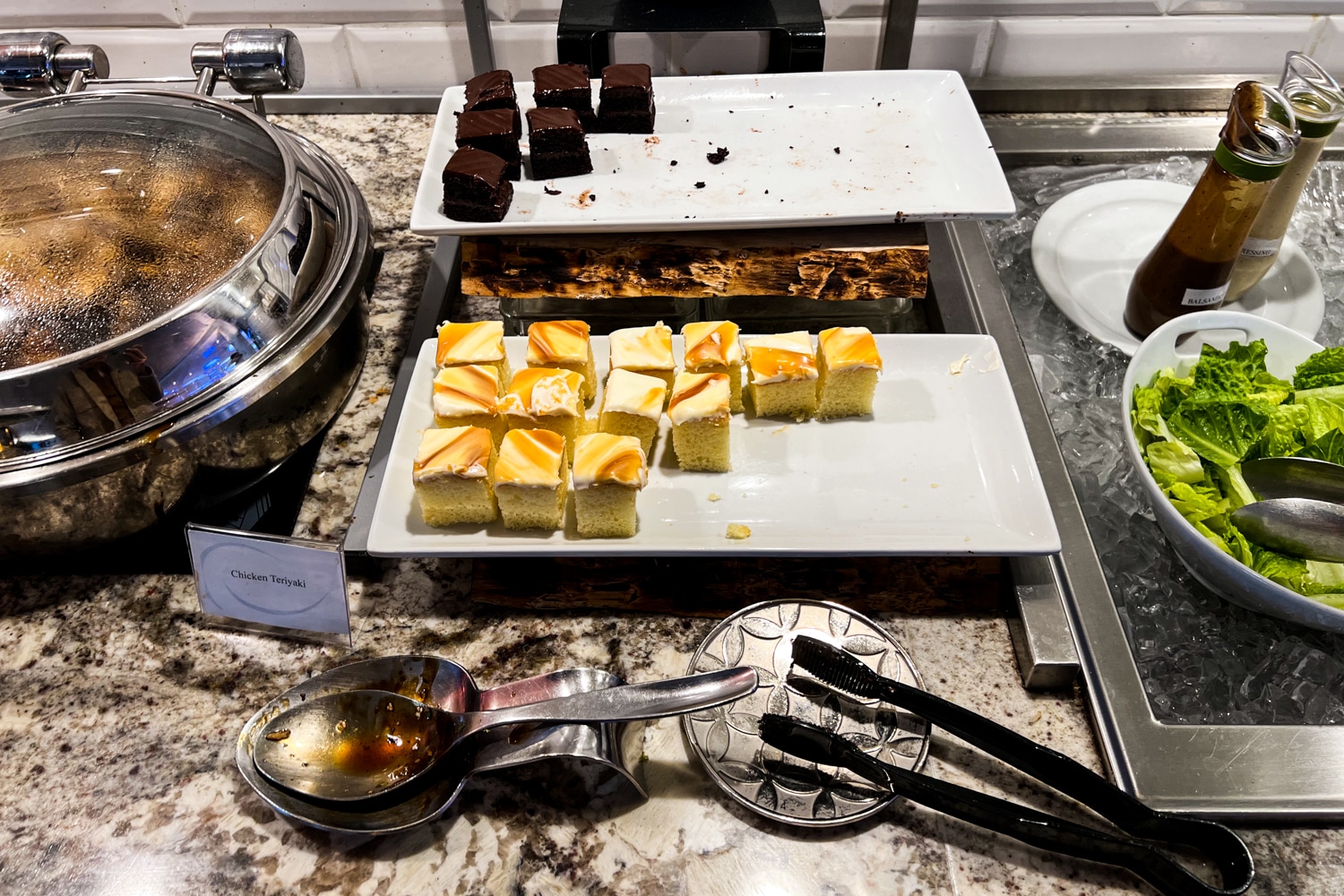 The lounge offers a selection of hot dishes, which, at the time of my visit, was teriyaki chicken accompanied by rice and buttered vegetables.