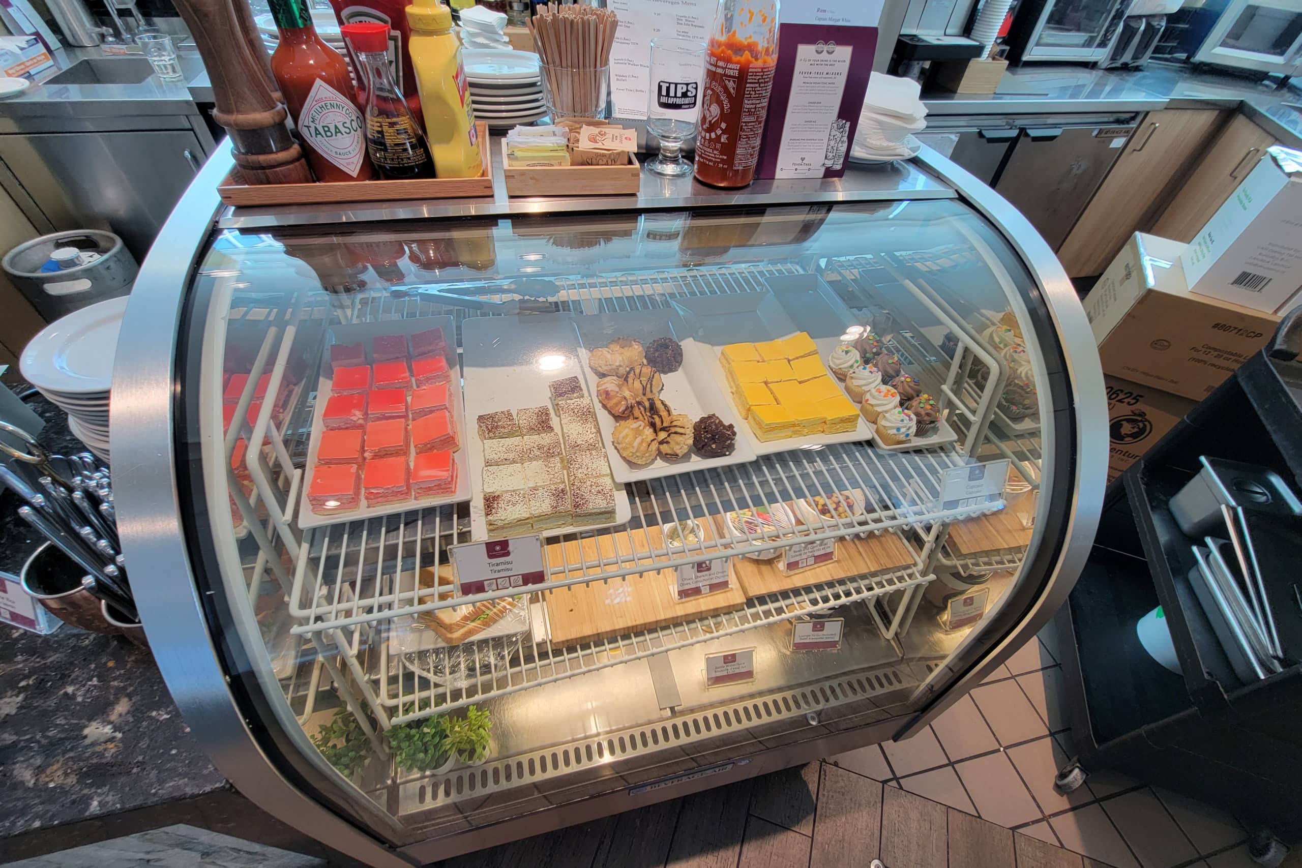 After waltzing in with a flash of my Platinum Card, I glanced at the buffet. The food was the exact same, indicating it’s probably cooked in the main location’s kitchen. Desserts likewise come from the same baker and/or confectioner.
