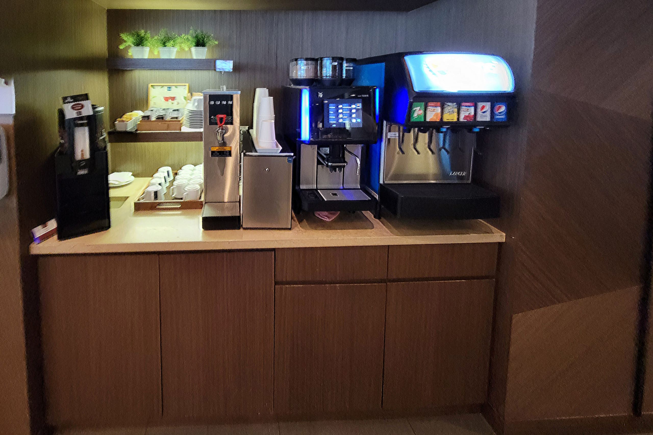 On the other hand, non-alcoholic beverages are entirely self-serve, and consist of a coffee machine, hot water for tea, and pop machine with the usual sugary suspects.