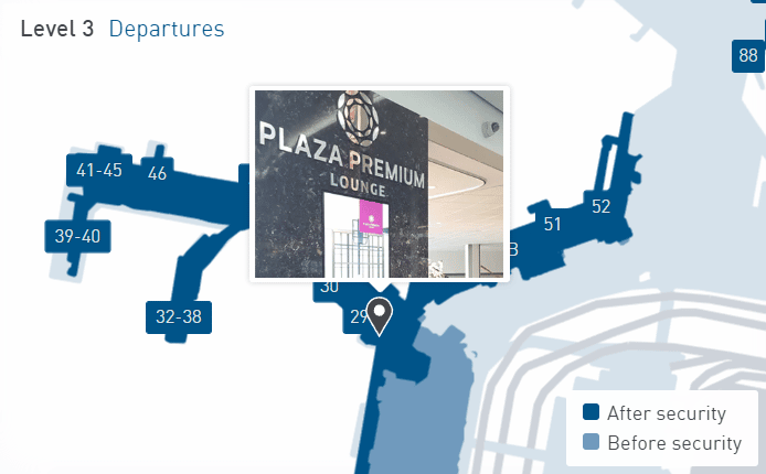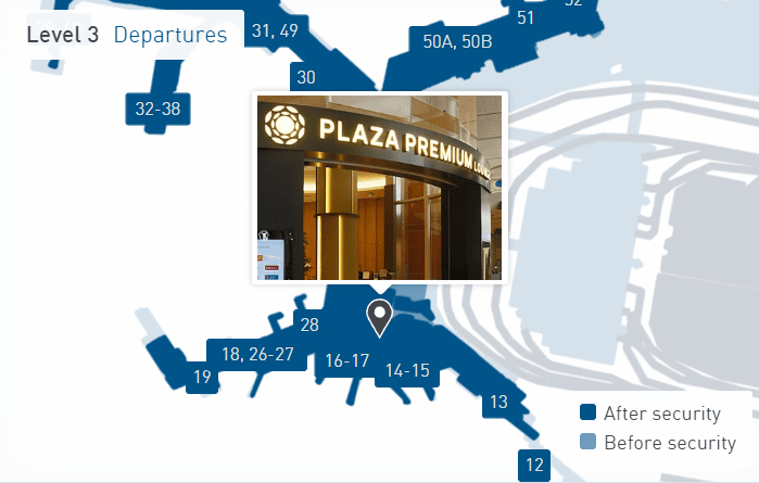 The primary Plaza Premium lounge is located between Gates 15–17 in Concourse B. Its branding is quite prominent and flashes in your face almost immediately after you exit security, so is hard to miss.