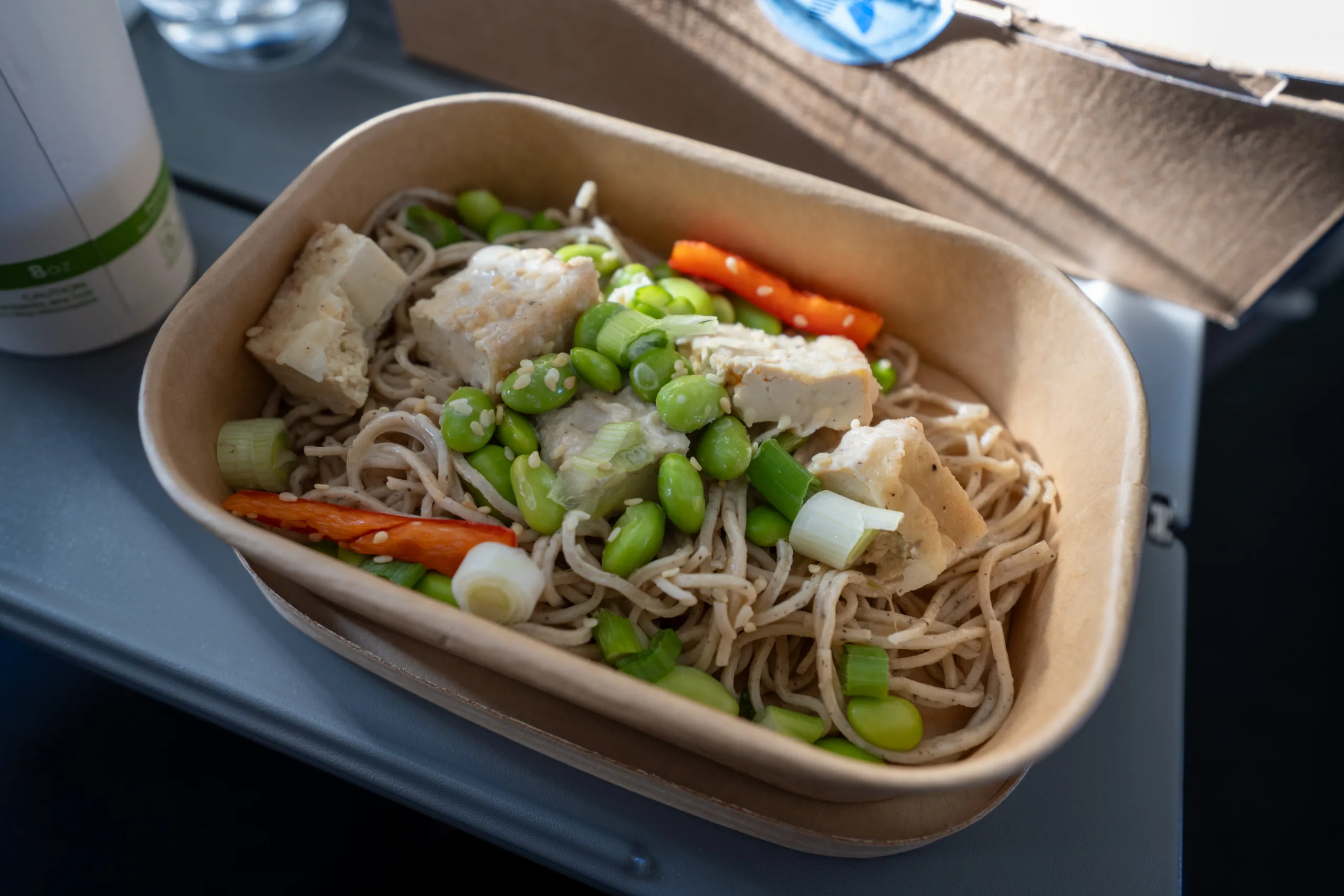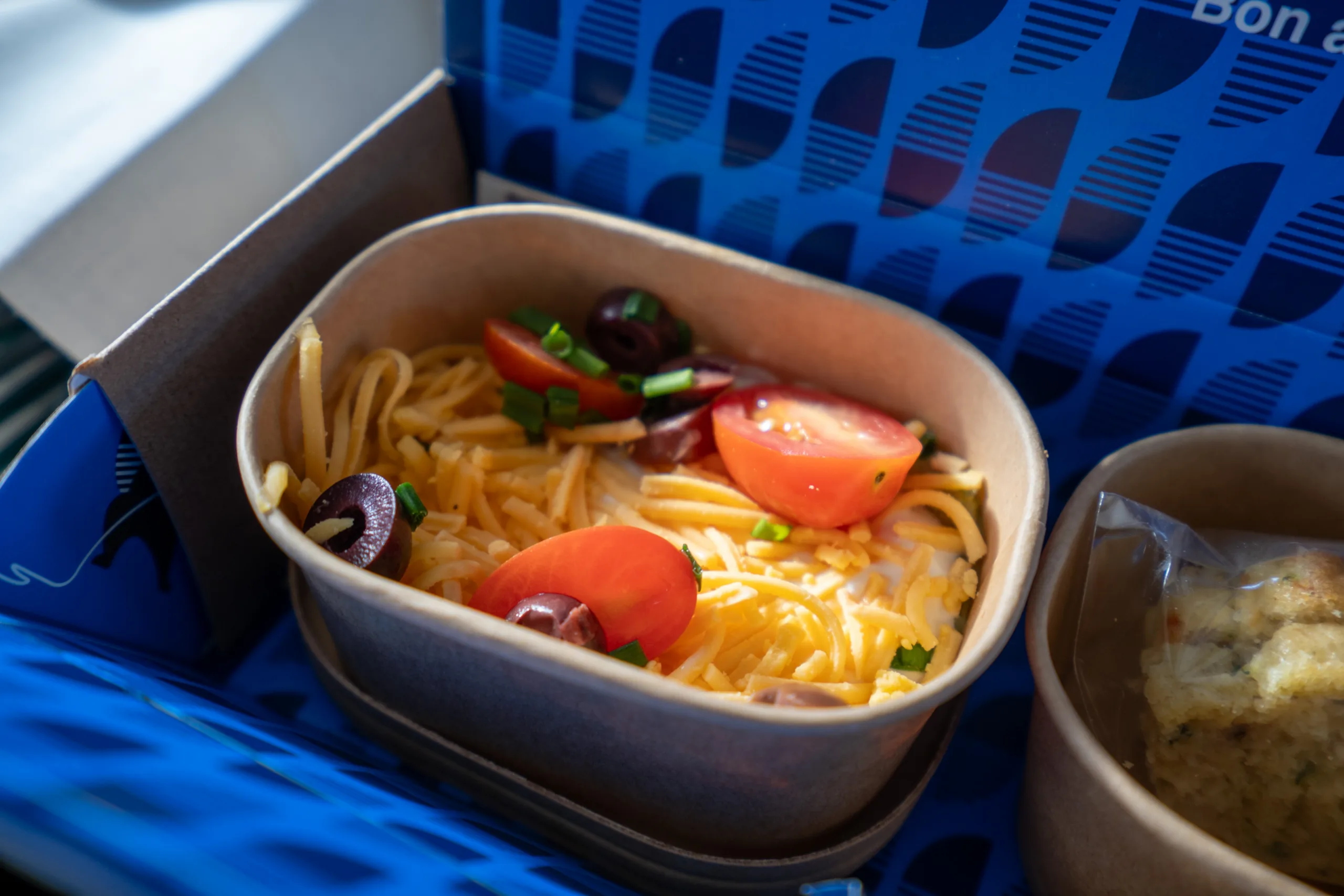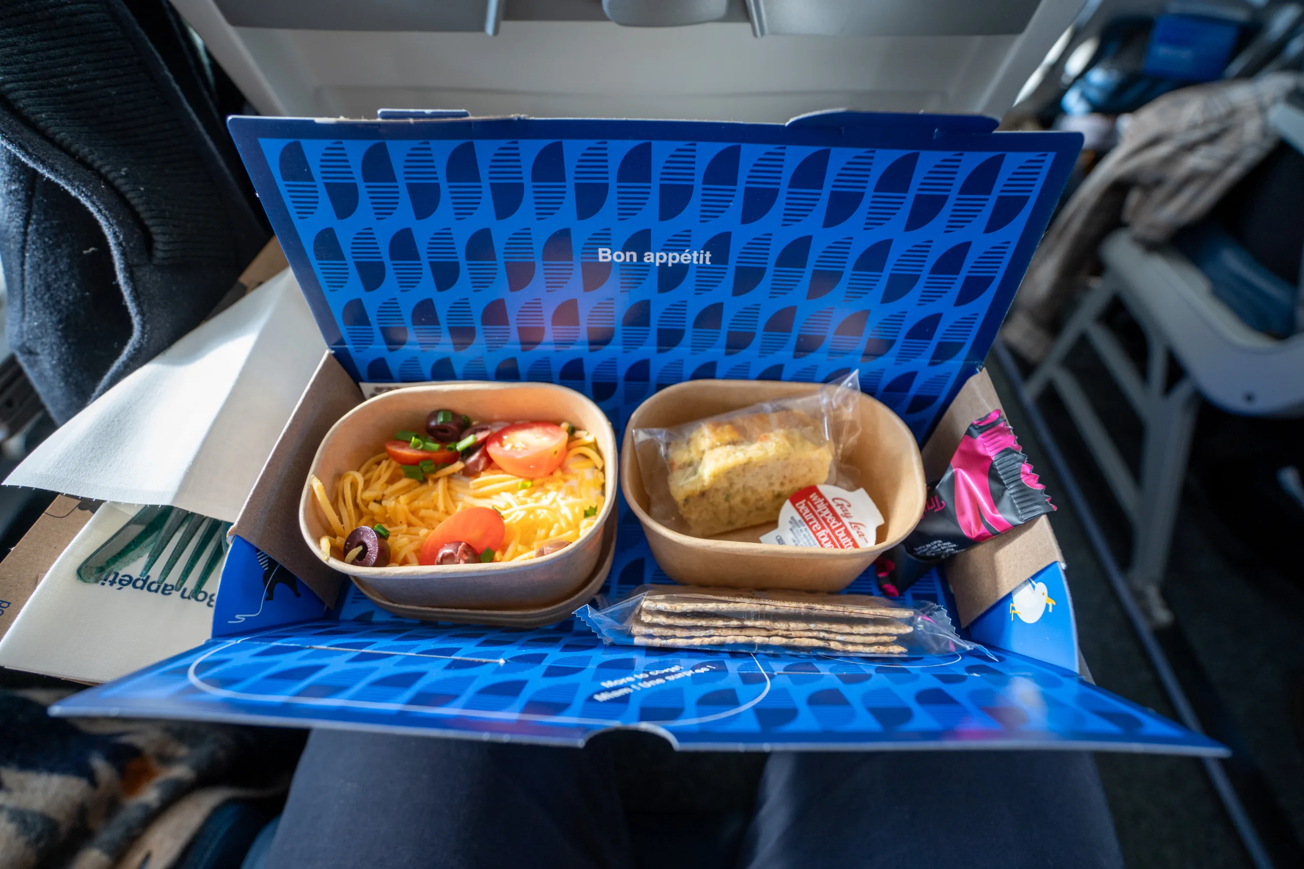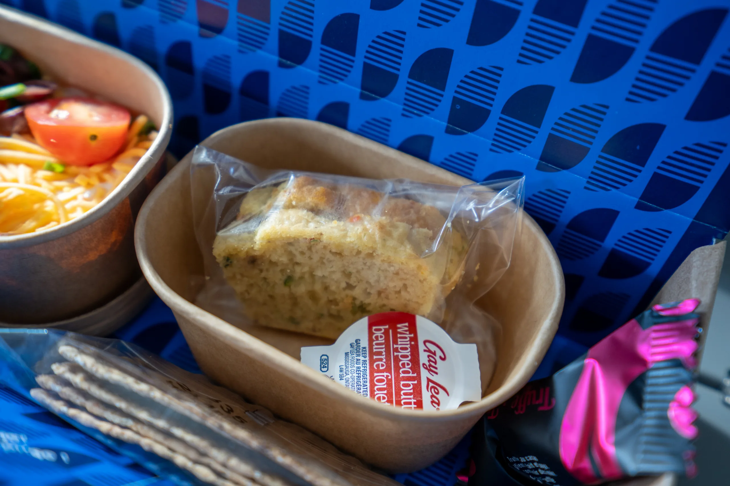 The meal service was presented in a clever meal box format, with the 7-layer Mexican dip and the zucchini loaf arriving first alongside the cutlery and a fun amenity (more on that later).
