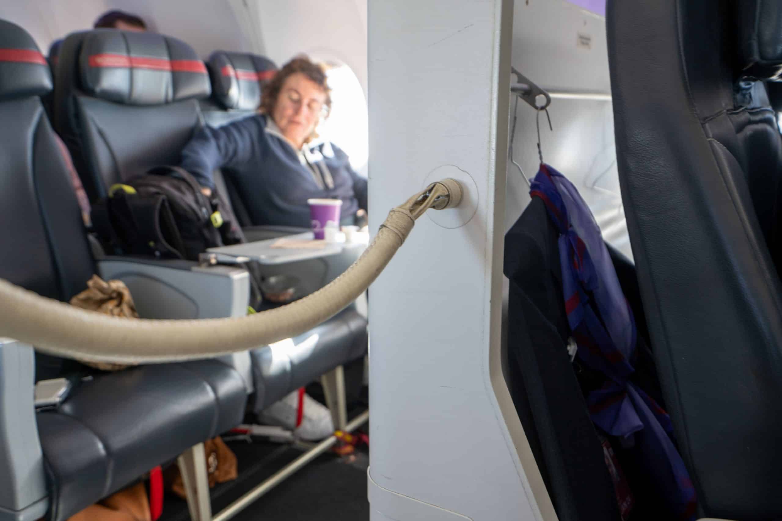 Interestingly, the business class and economy cabins are simply separated by a plastic screen and a removable rope placed across the aisle.