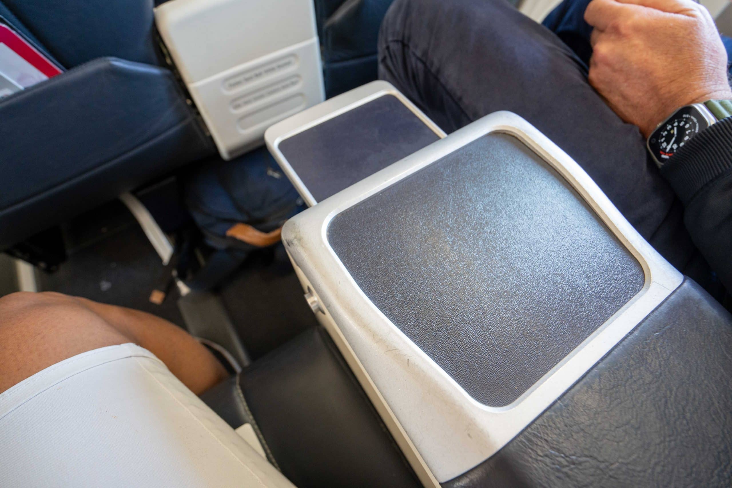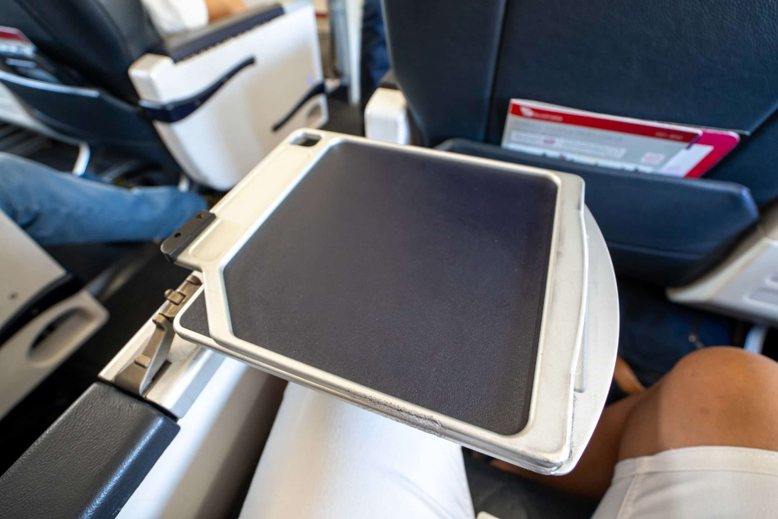 The outer armrest holds the retractable tray table, which may be rotated outwards from its housing and then folded into place for use.