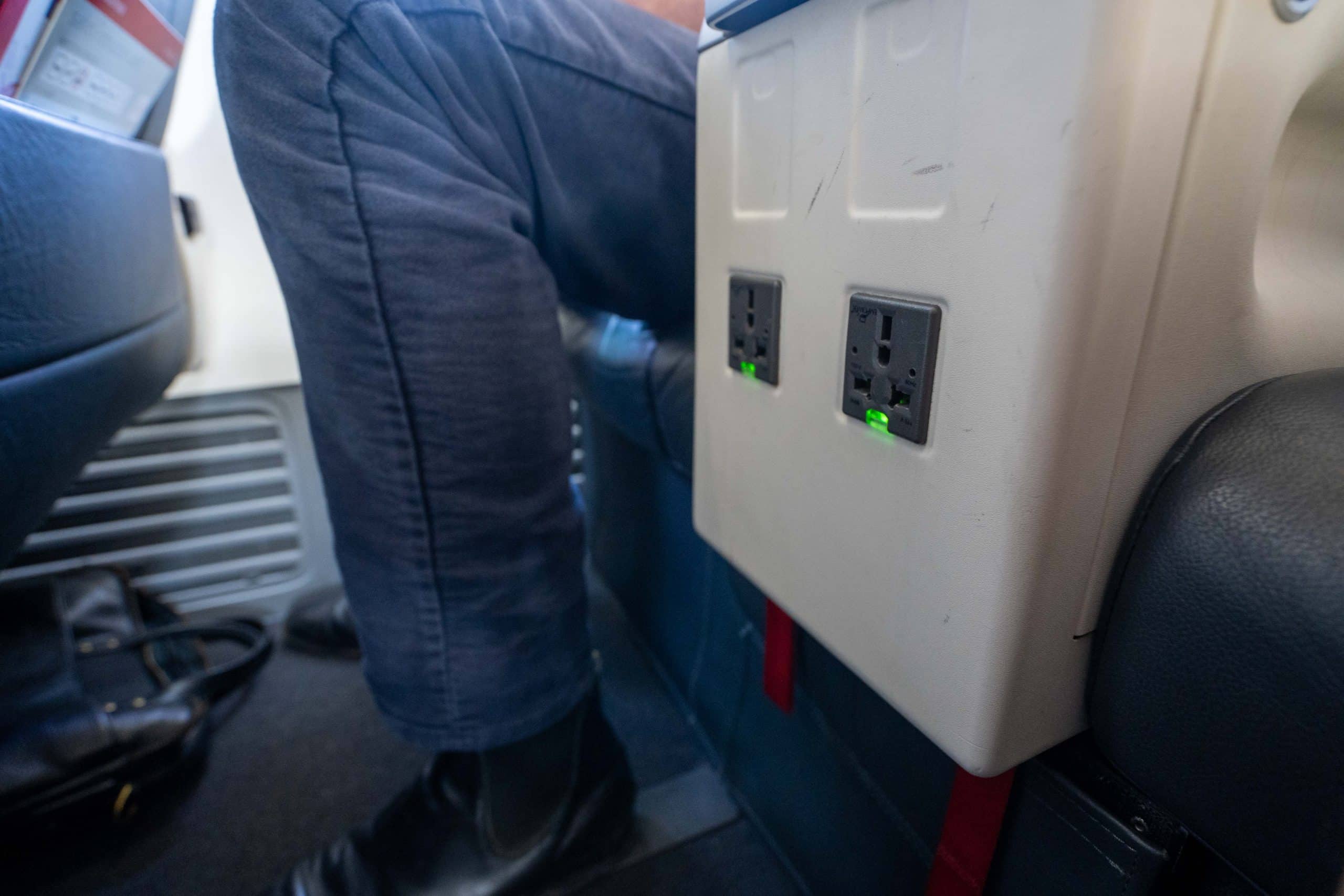 Positioned between the two seats are universal power outlets.