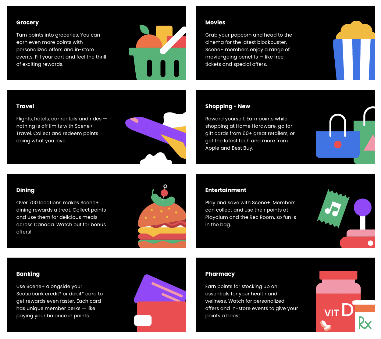 That said, Scene+ does offer a broad range of redemption options. For one, you can redeem your Scene+ points to save on groceries, entertainment, restaurants, and household supplies, directly at partnered merchants, including: