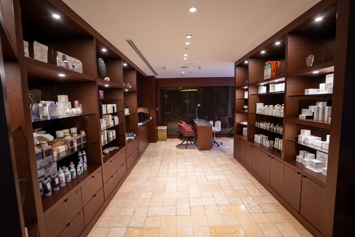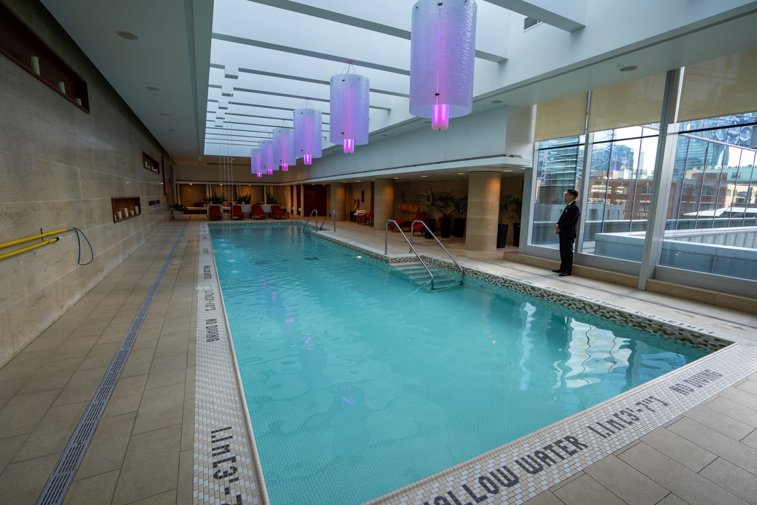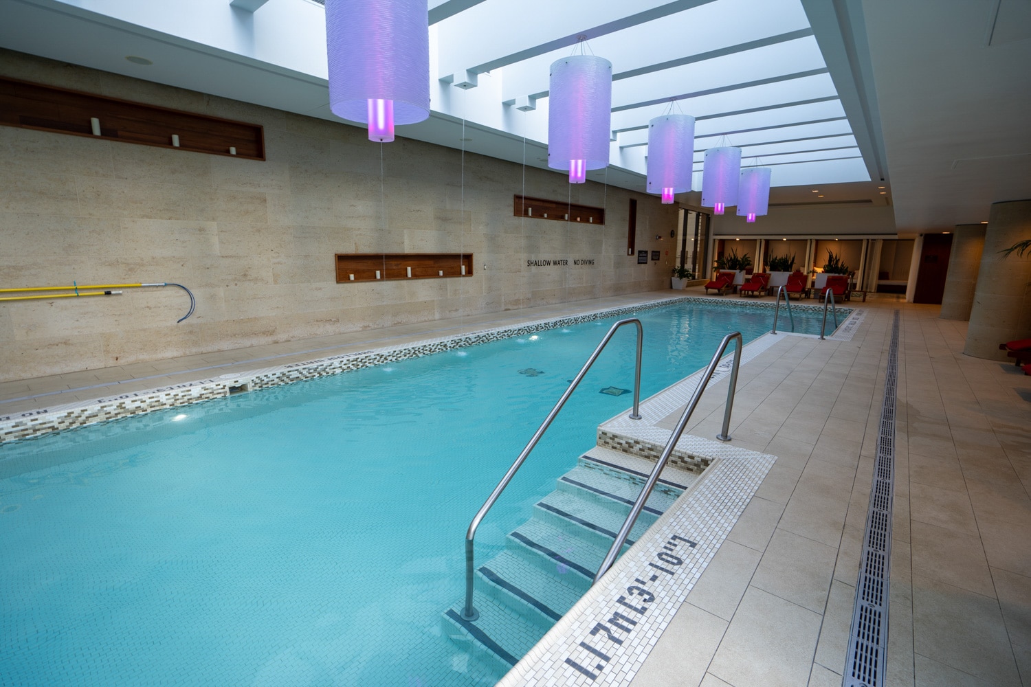 Under a glass canopy, the spa offers an impressive 20-metre lap pool, hot tub, and infrared sauna. The pool features a cascading waterfall installation where water flows down from the roof into the pool.