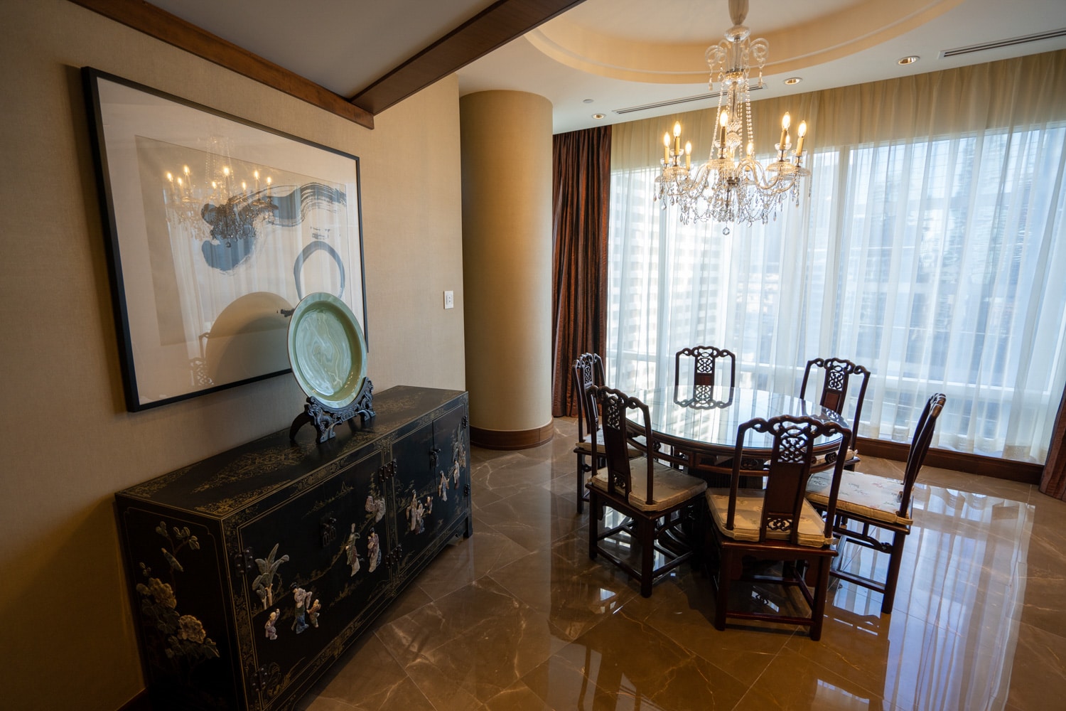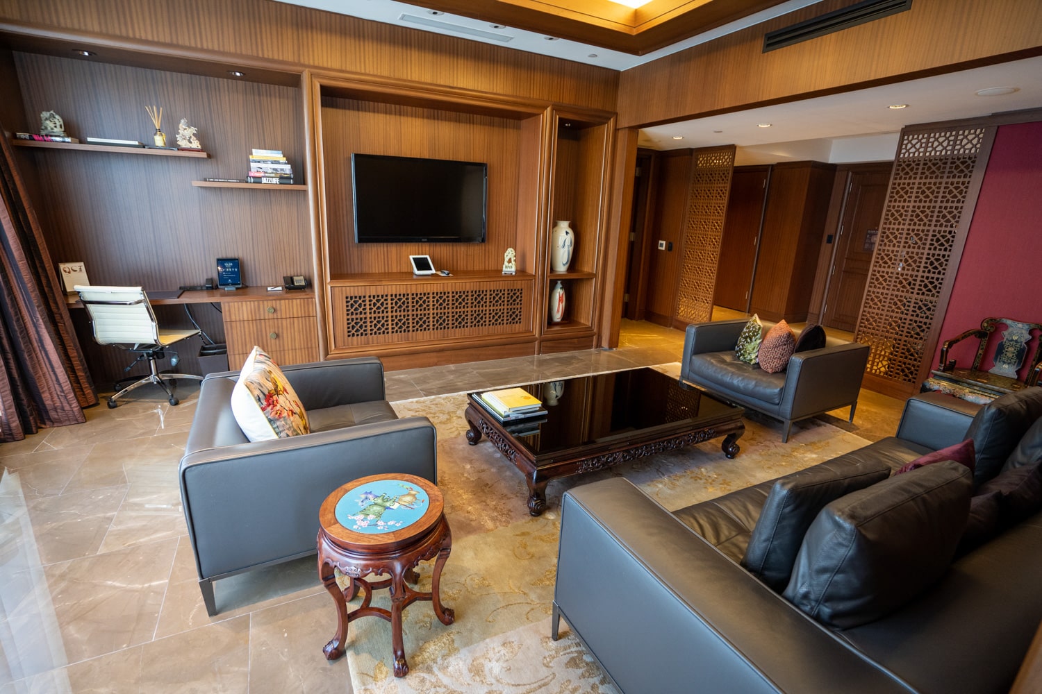 The lobby lounge is elegant and opulent, with timber lattice and Asian-inspired décor, including four large-scale Chinese calligraphy paintings.