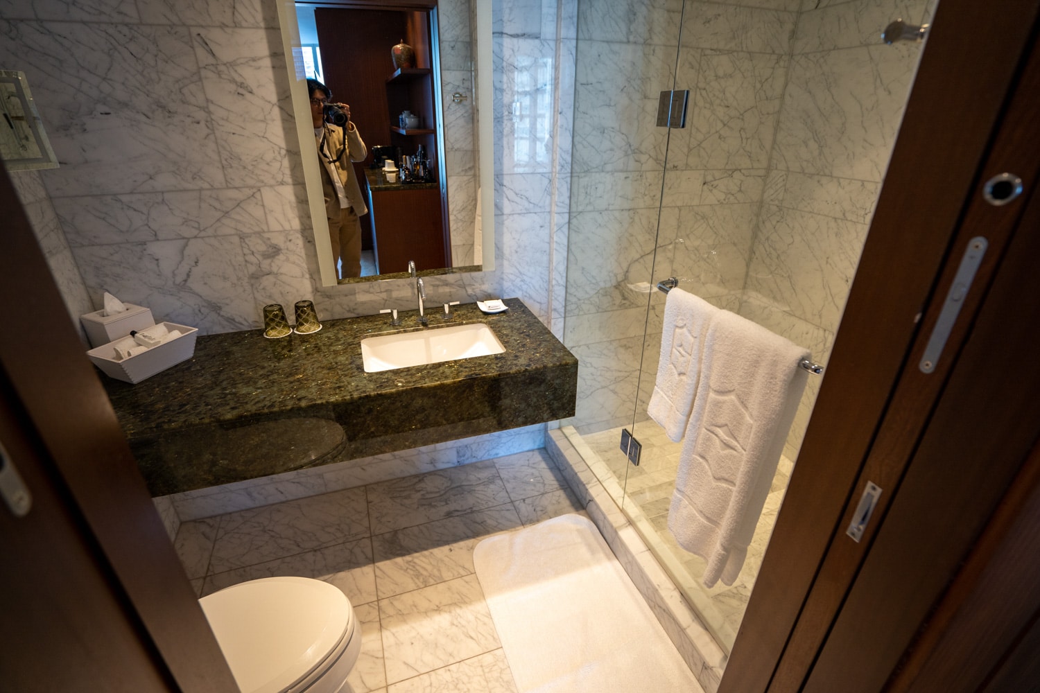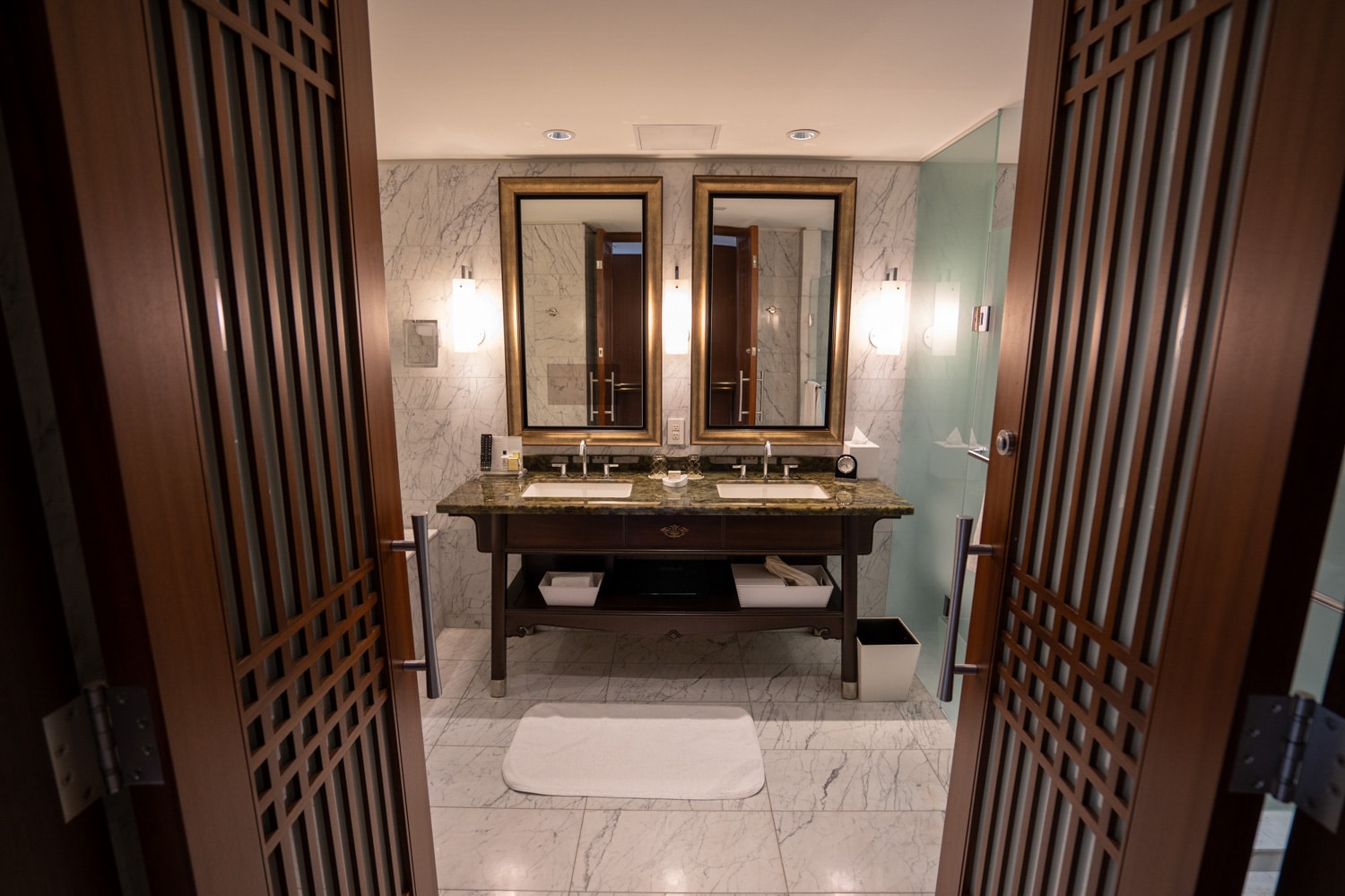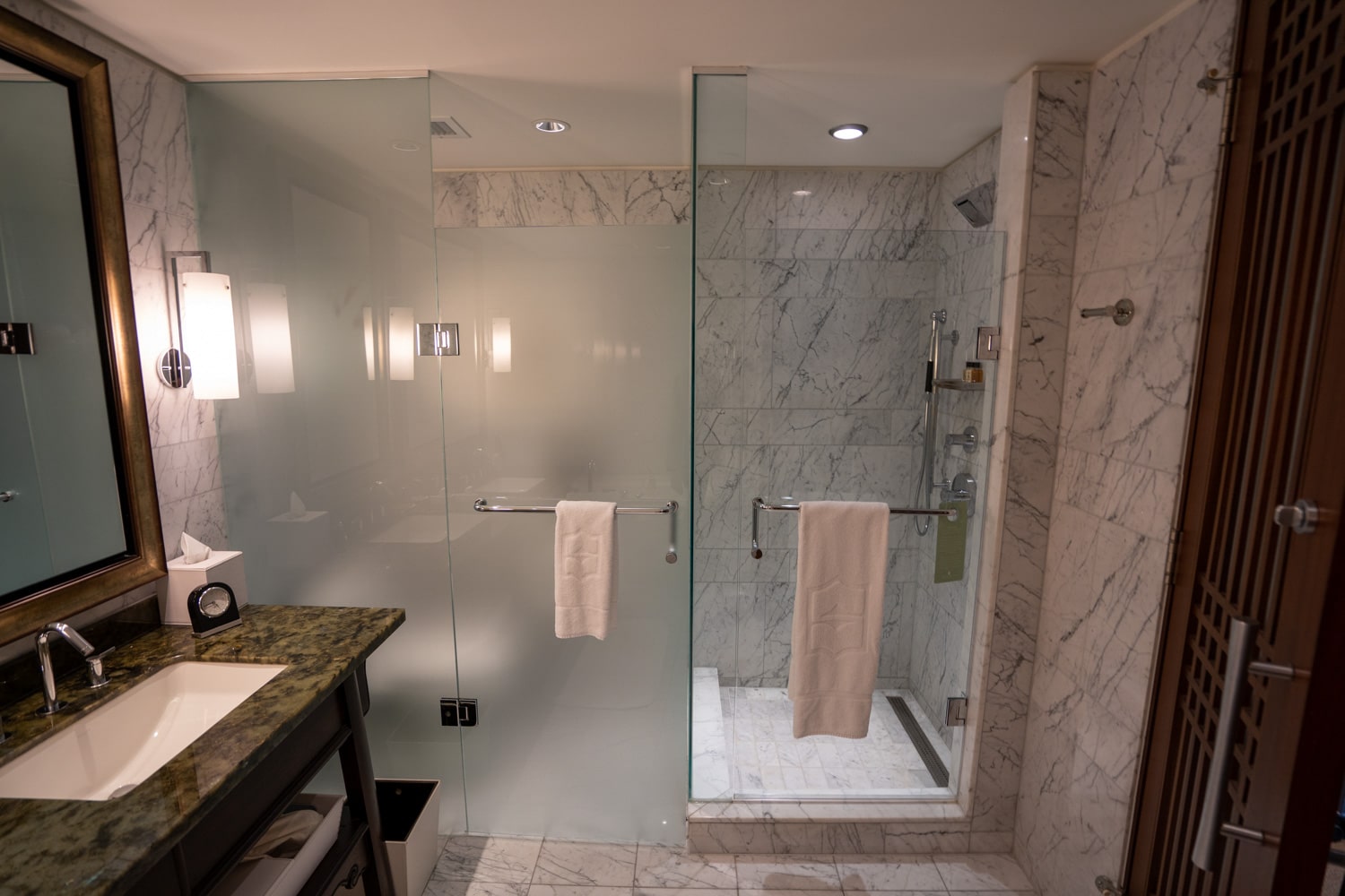 The bathroom is immediately to the right as you enter. It’s spacious and beautiful, with the floor and walls adorned in marble.