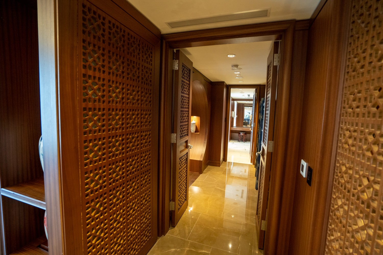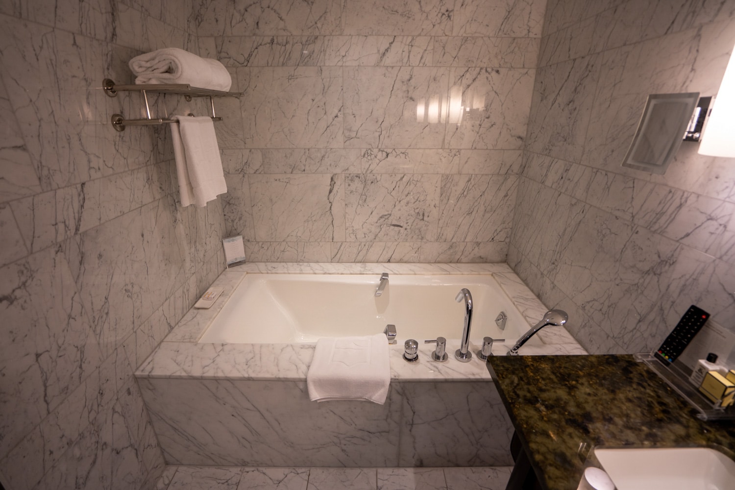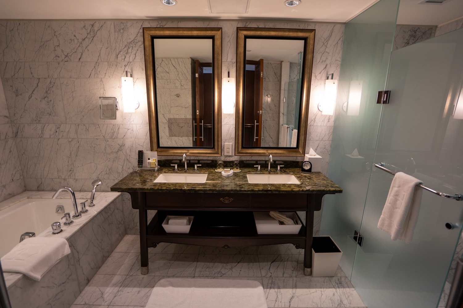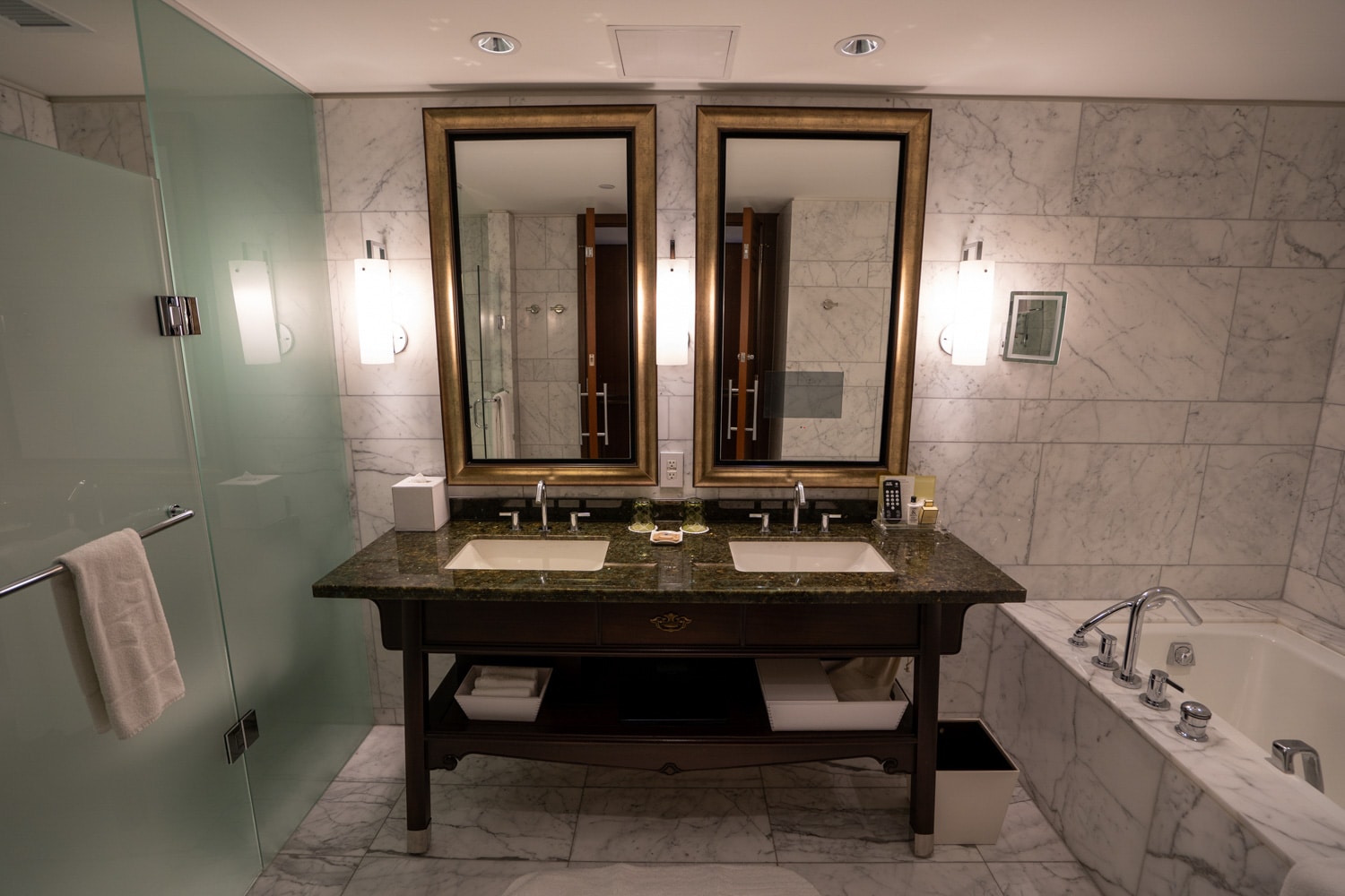 The bathroom is immediately to the right as you enter. It’s spacious and beautiful, with the floor and walls adorned in marble.