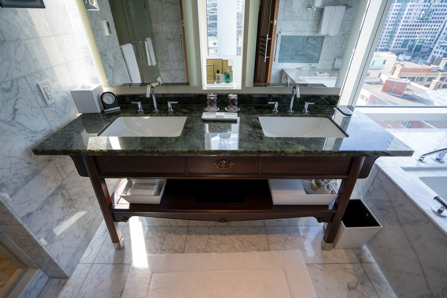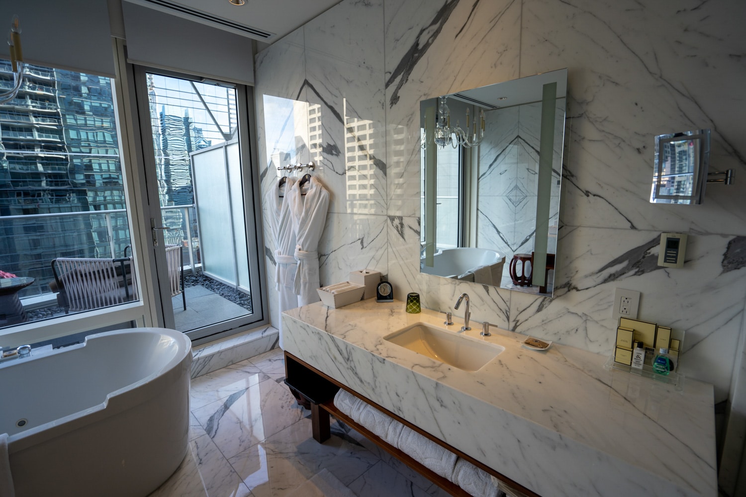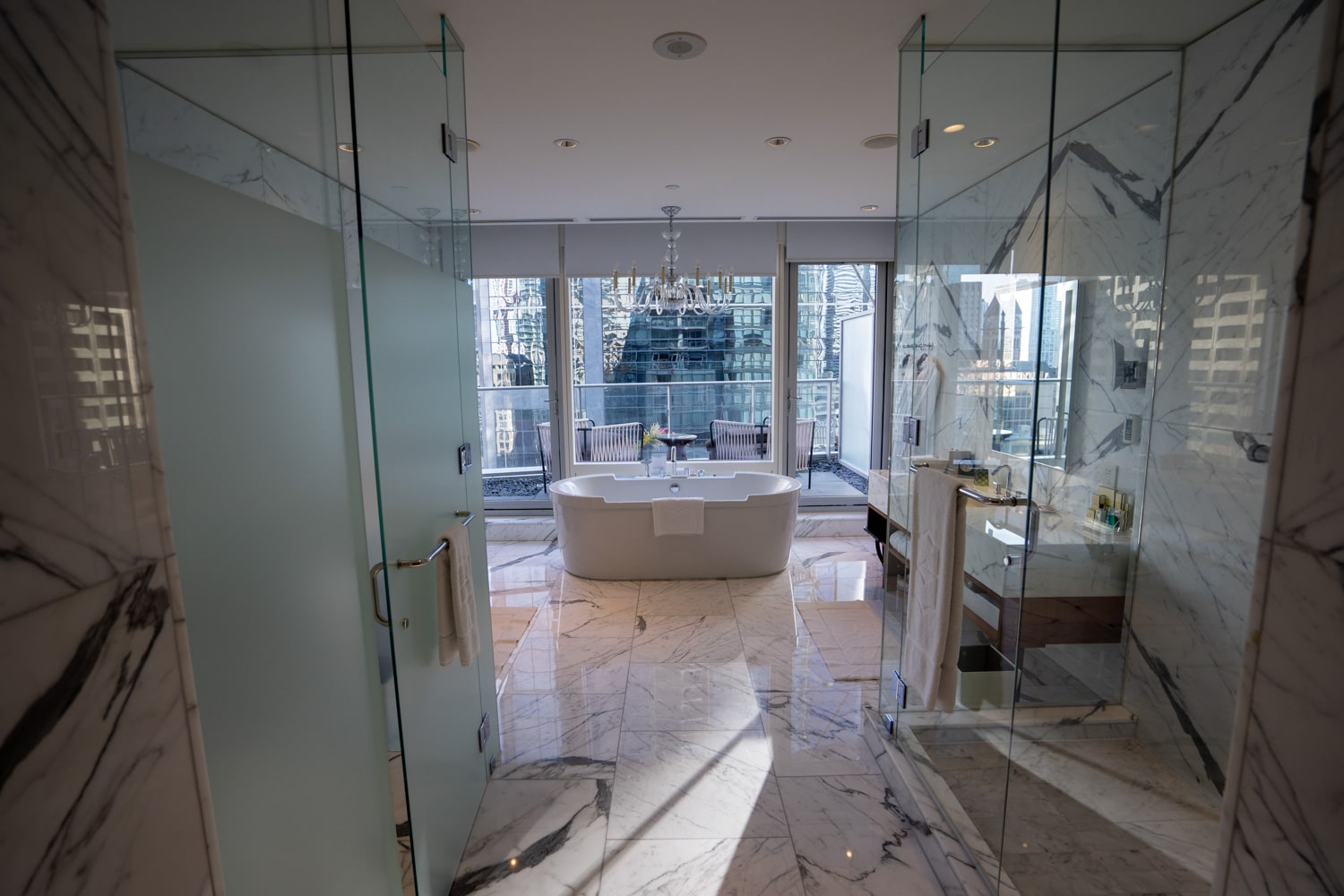There are two luxurious full-marble bathrooms. The primary bathroom has a tub in the centre overlooking the views of the city, and single vanities on each side.