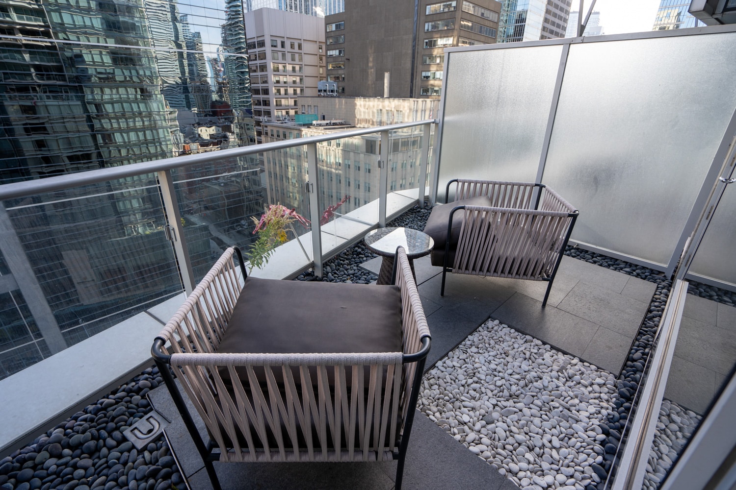 From the primary bathroom, there is access to a balcony with two chairs overlooking the downtown core.