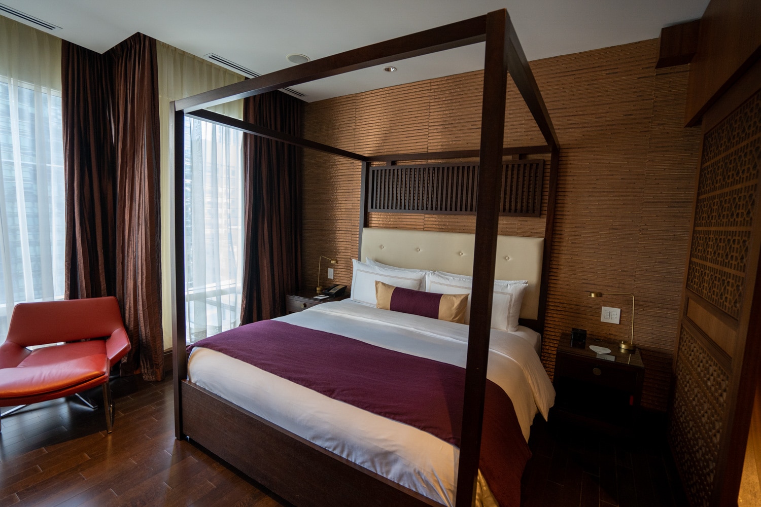The primary bedroom has an opulent canopy bed surrounded by rich wood oak panelling and Japanese lattice screens.