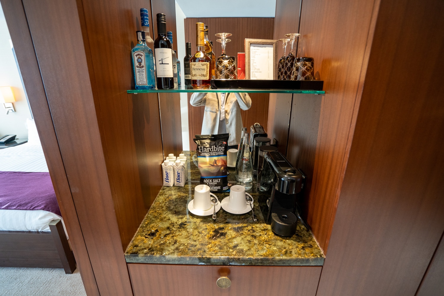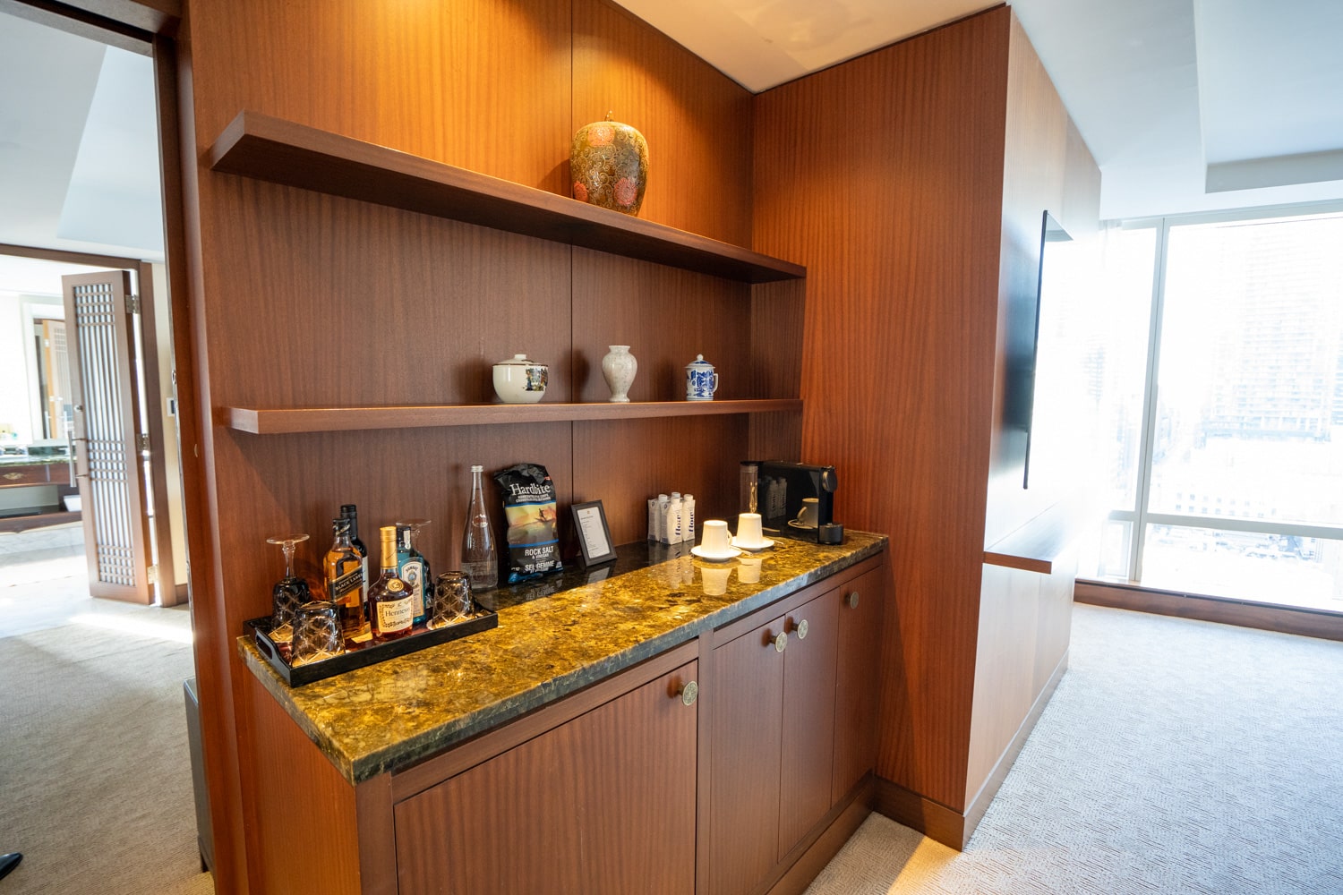 The pantry is located to the right at the end of the foyer, just before the room opens up. Here, you’ll find a Nespresso coffee maker, a selection of coffee and tea, and a well-appointed minibar.
