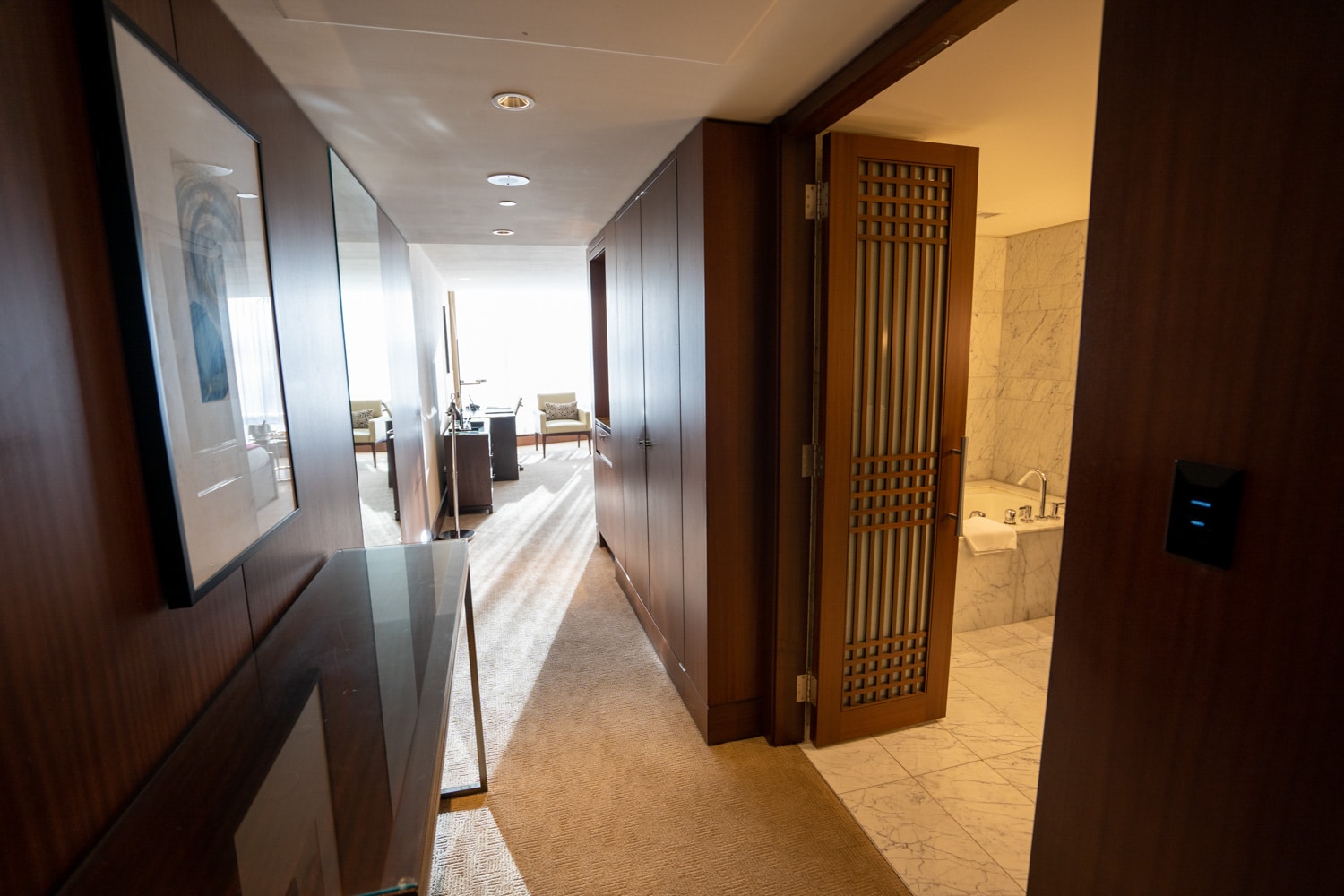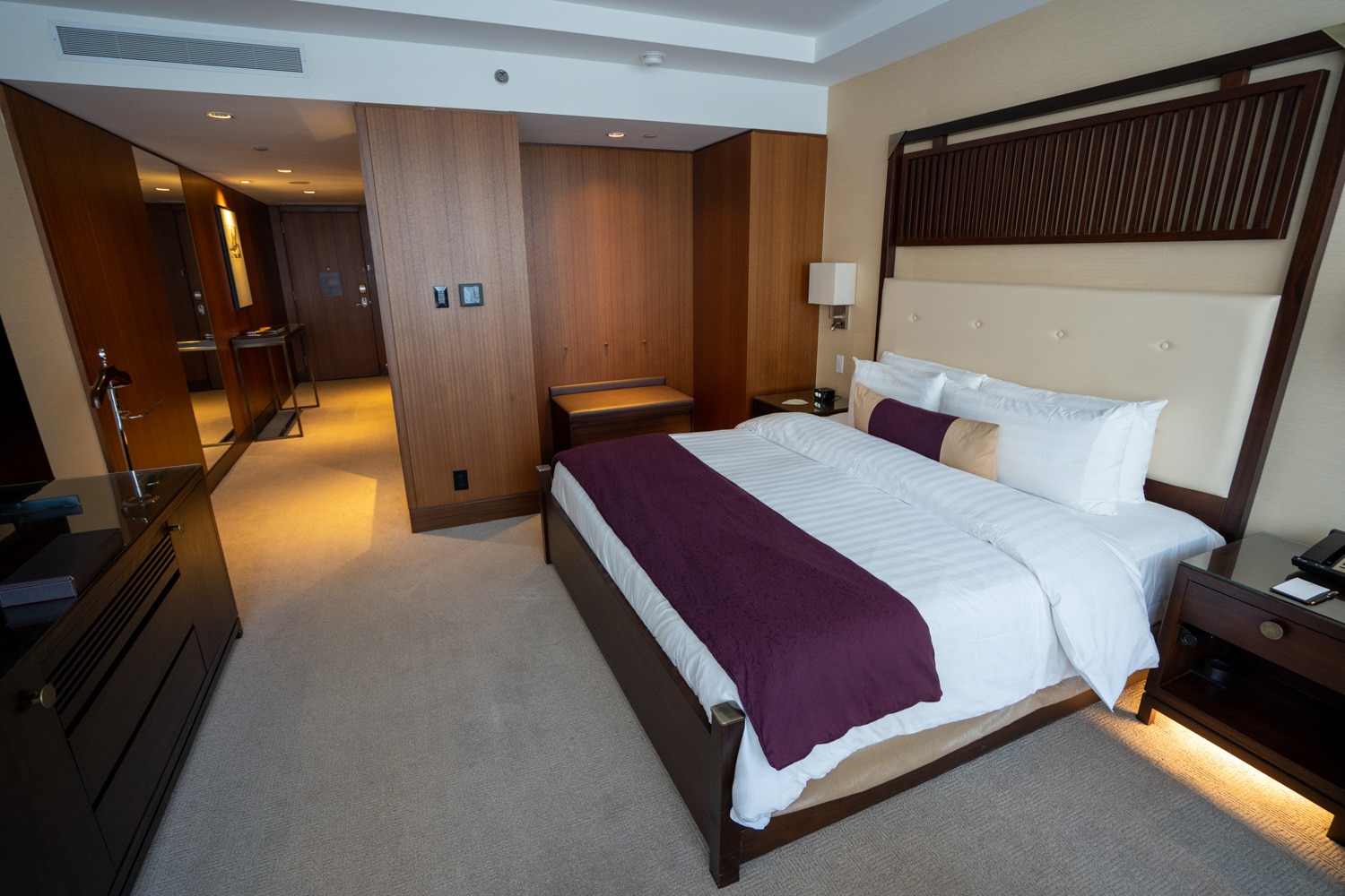 Upon entering the suite, a narrow foyer leads into the main bedroom, which exudes a traditional sense of elegance.