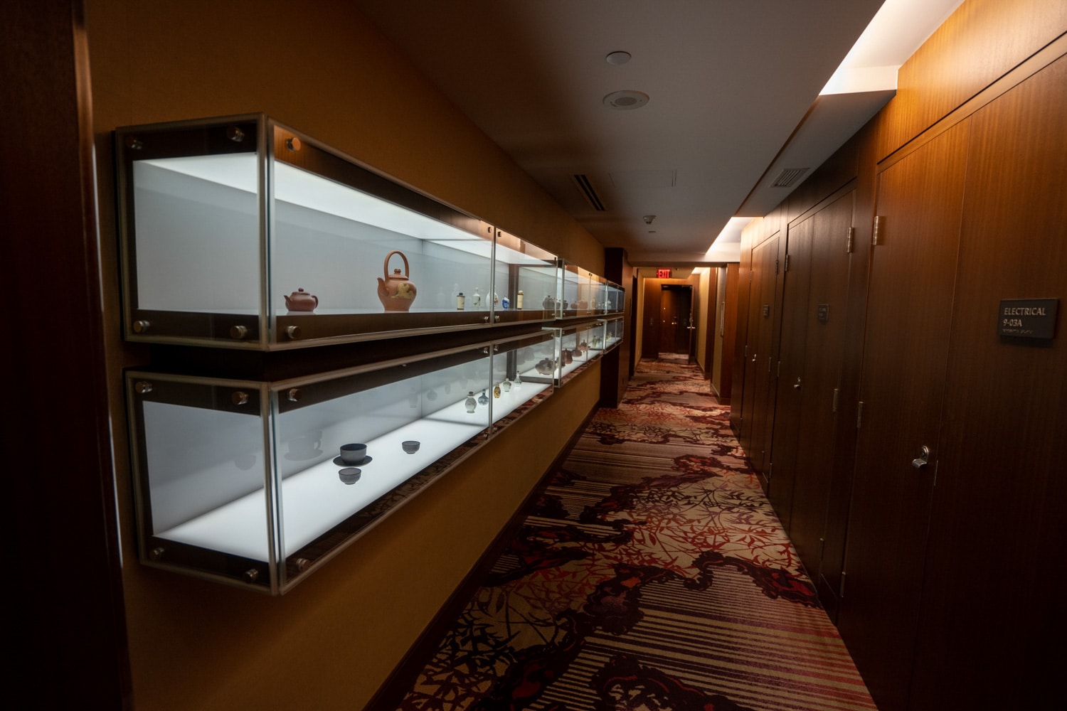 The hallways leading to the guest rooms are lined with dark wooden walls, detailed red and violet carpeting, and tea motifs in display cases.