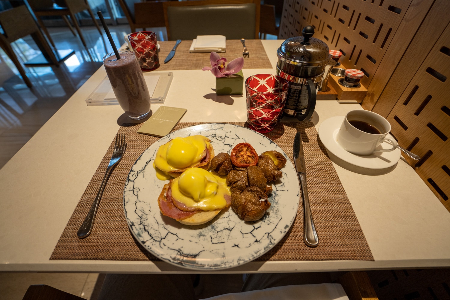 I opted for a refreshing smoothie along with eggs Benedict with roasted potatoes and a hot coffee. The breakfast was delicious, and the coffee was served in a large French press, which was certainly an impressive touch.