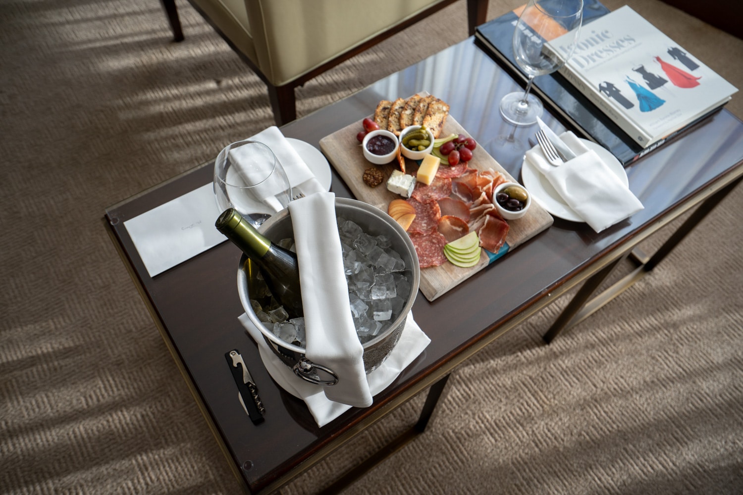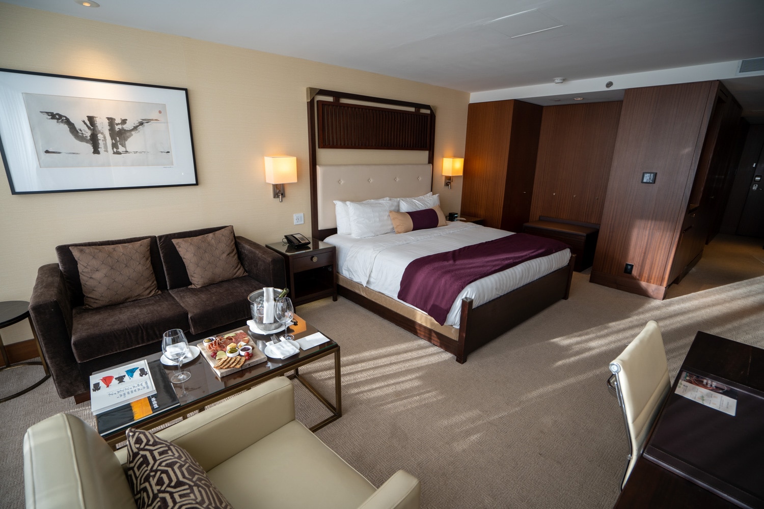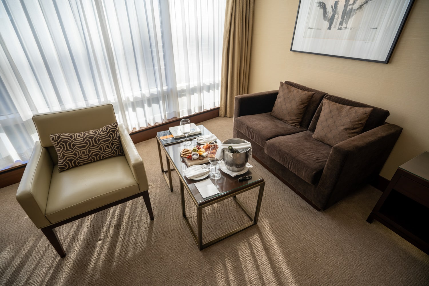 Adjacent to the bed is a plush brown couch with a coffee table, side table, and reading chair. Sitting on the table awaiting our arrival was a beautiful charcuterie spread and a bottle of sparkling wine.