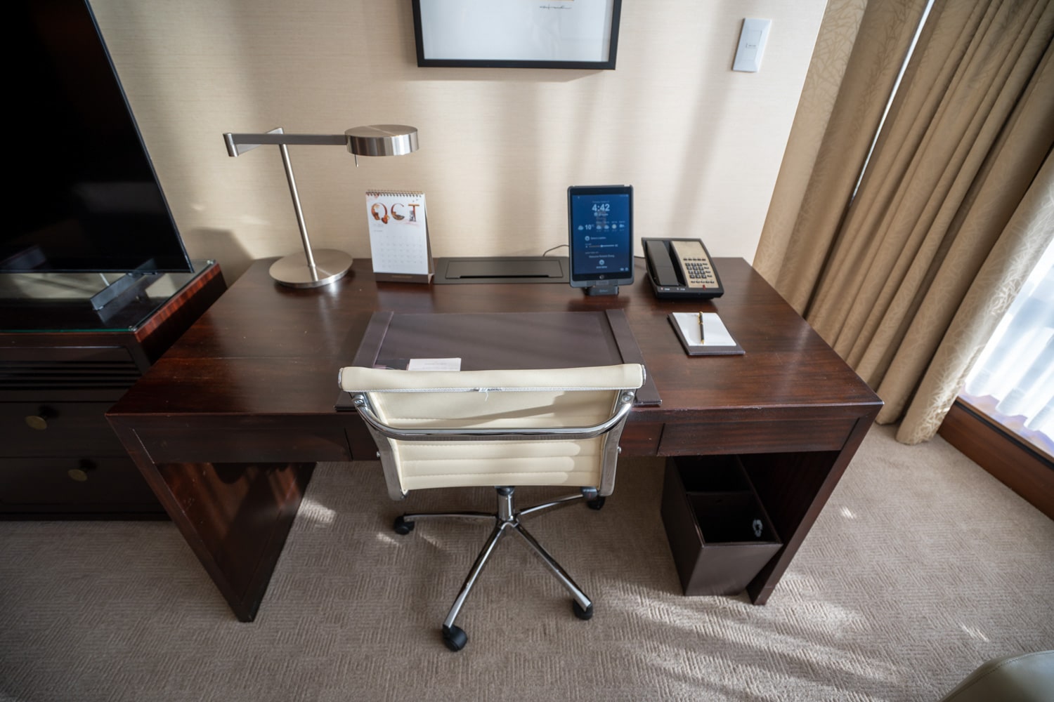 On the opposite wall is a desk, and to its left is the room’s flat-screen TV.