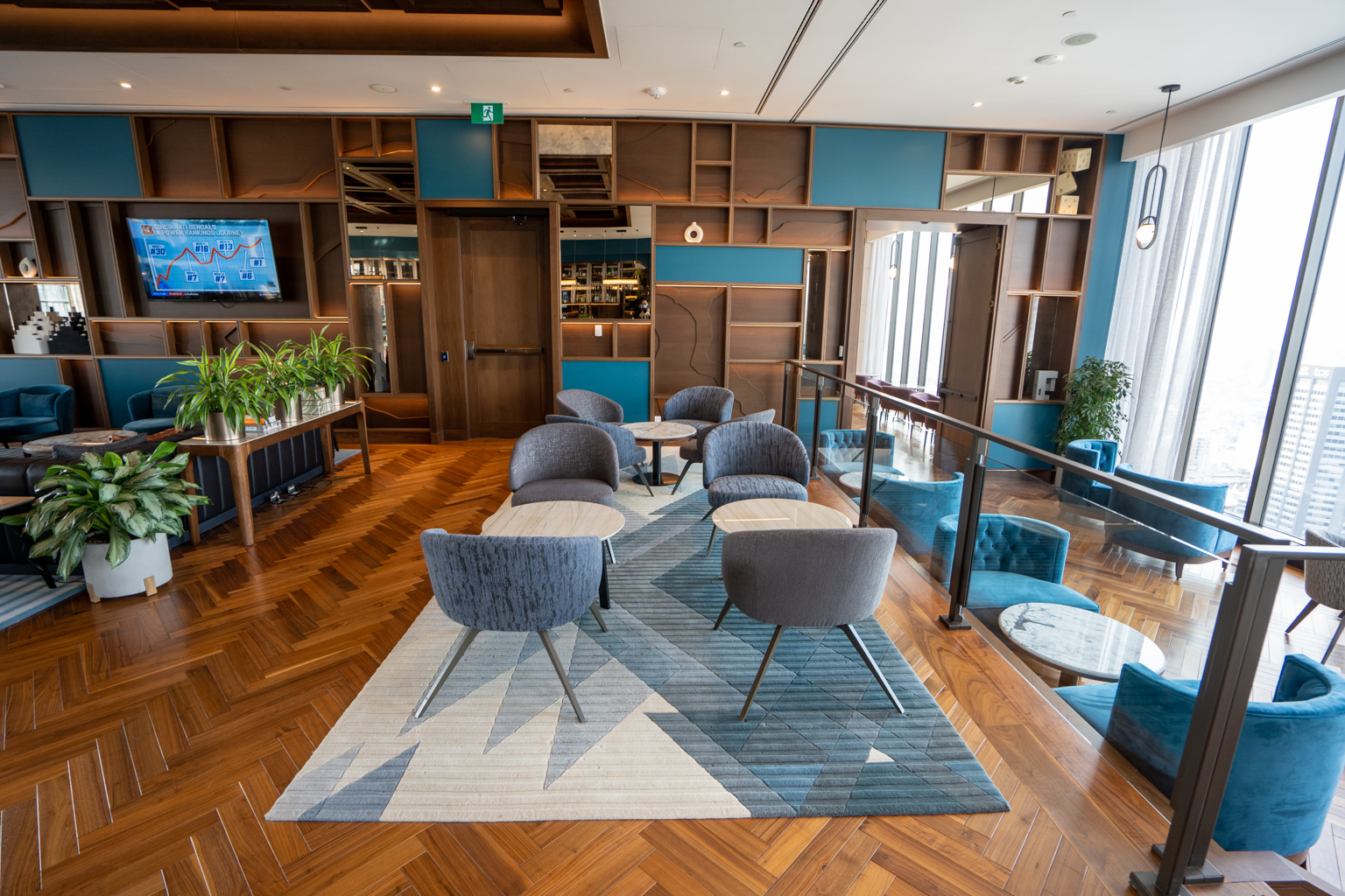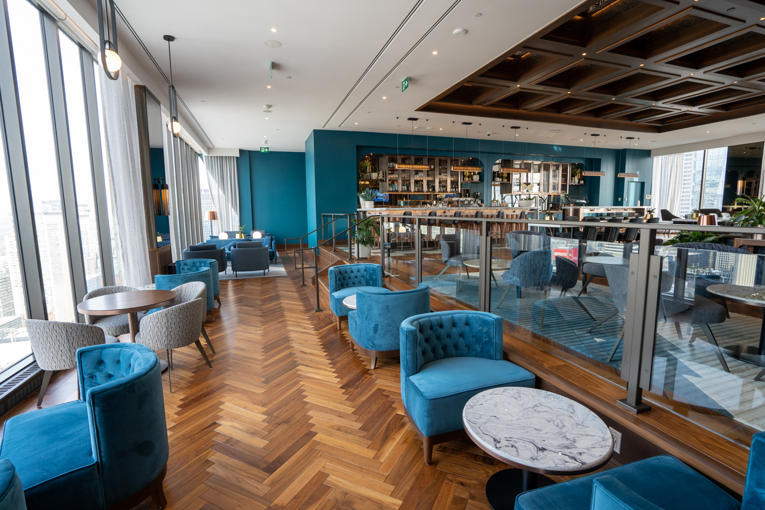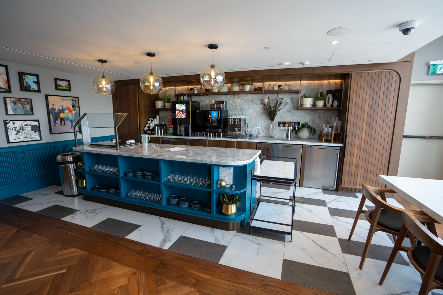 The new interior design is vibrant and eye-catching, with a heavy emphasis on blue hues and wooden features.
