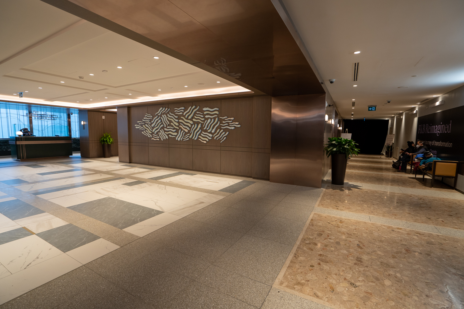 There is a small check-in area showcasing a new design; once complete, the lobby will feature blue, marble, and bronze aesthetics along with Toronto-centric art.