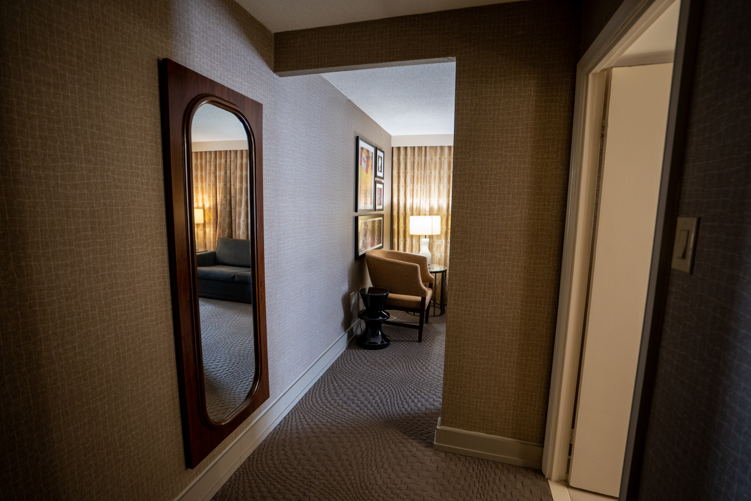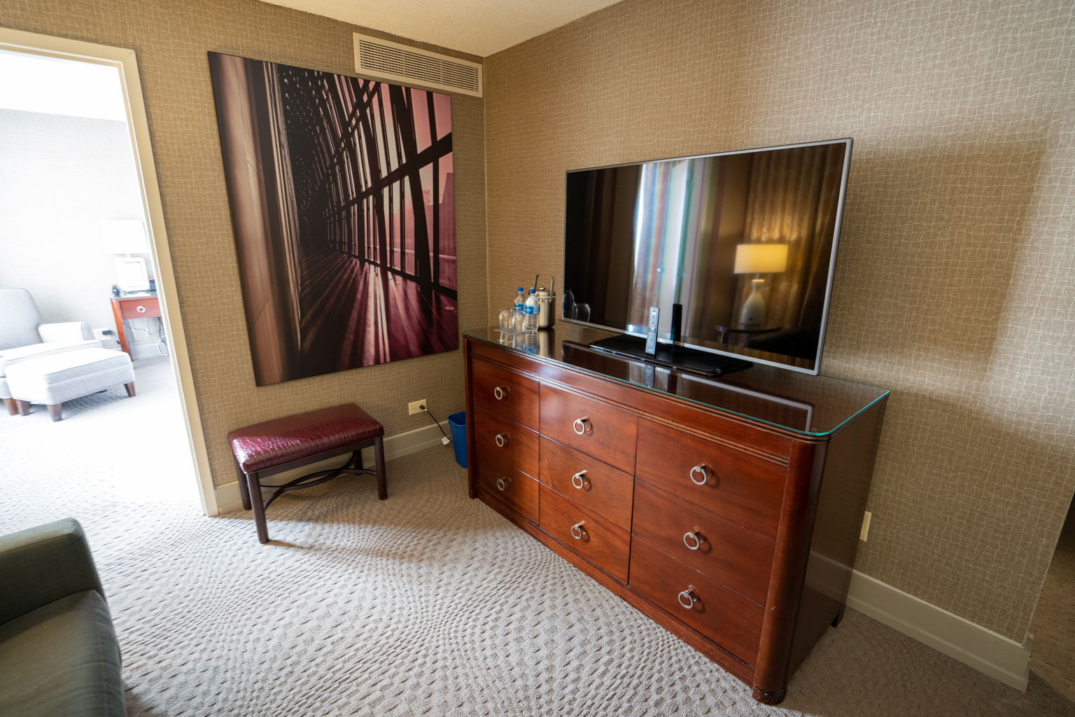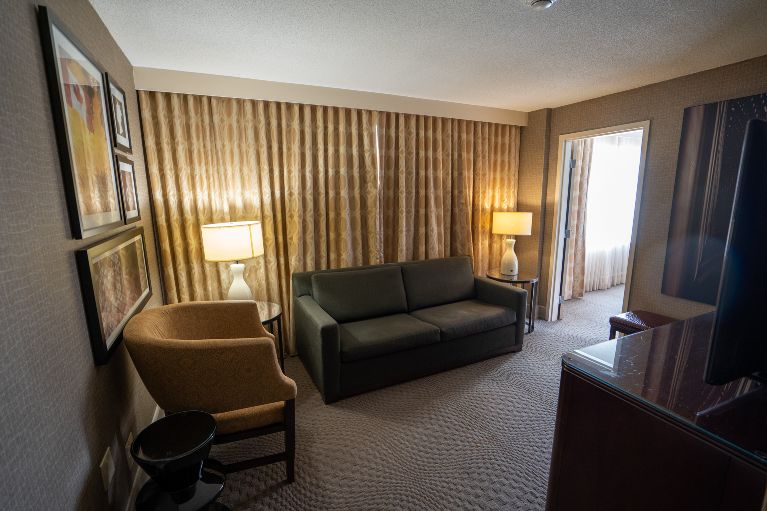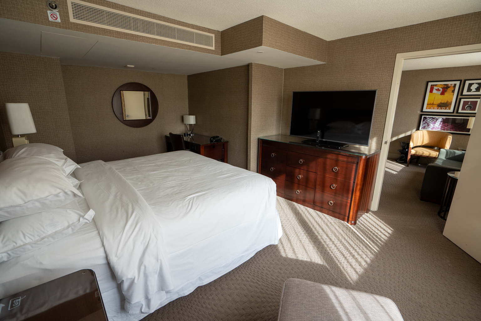 The suite consists of muted tones of brown, and the walls were decorated with Canadian-themed artwork. The living room was fitted with a sofa and a television atop of a mahogany bureau directly across.