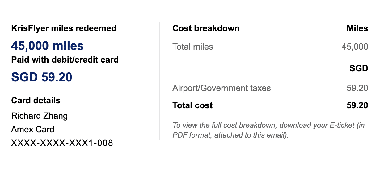 In my case, I was able to snag this flight for a total of 45,000 KrisFlyer miles at the Saver level, plus a modest sum in taxes and fees of around $59 SGD ($60 CAD).