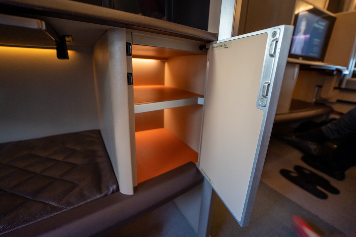 Adjacent to the ottoman is a storage compartment that plays host to two racks for stowing personal items. You can store your larger items either beneath the ottoman or within the storage locker that is conveniently located between your seat and the bulkhead.