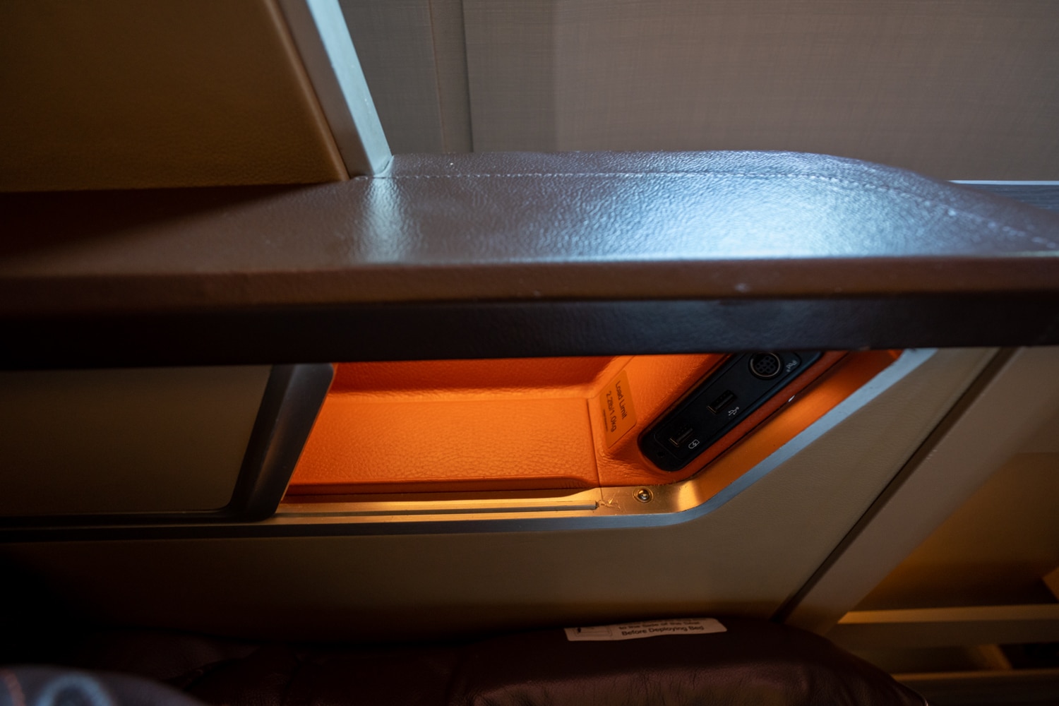 While on the window side, a secondary small compartment houses two USB ports and enough space for your phone.