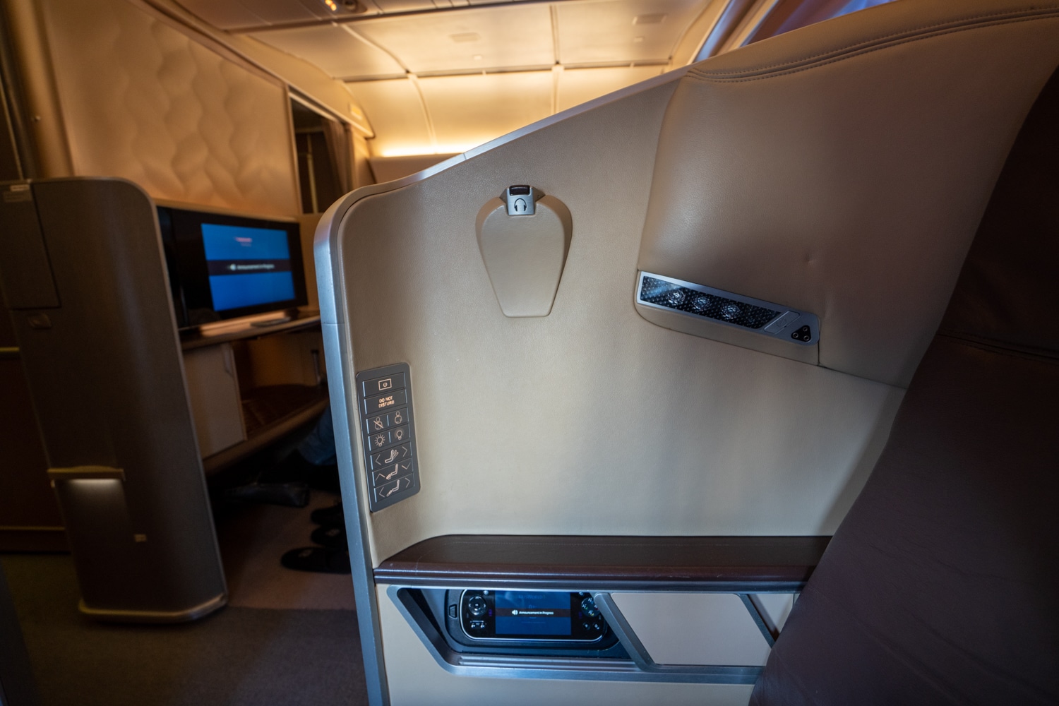 The 777 First Class cabin is characterized by the airline’s signature warm palette of taupe and brown. At the bulkhead, there’s a softly lit textured surface, adding an elevated touch to the cabin.
