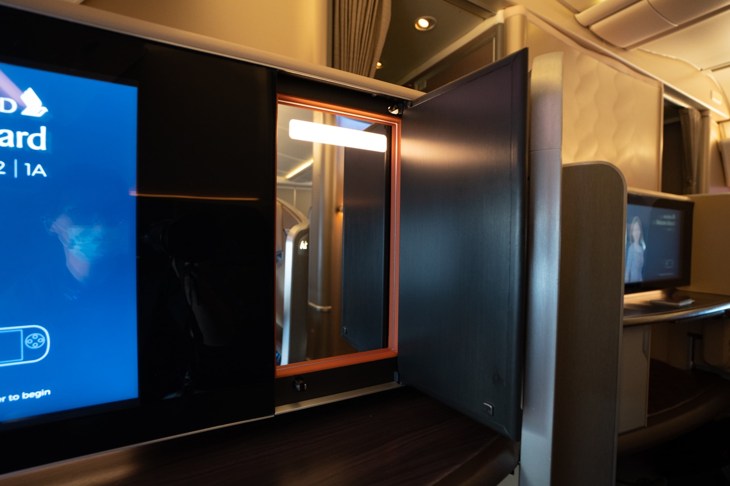 Upon settling into your seat, you’ll observe an impressive 24-inch in-flight entertainment screen easily within arm’s reach. An adjacent discreet door conceals a vanity mirror, and a console just below offers some horizontal surface space.