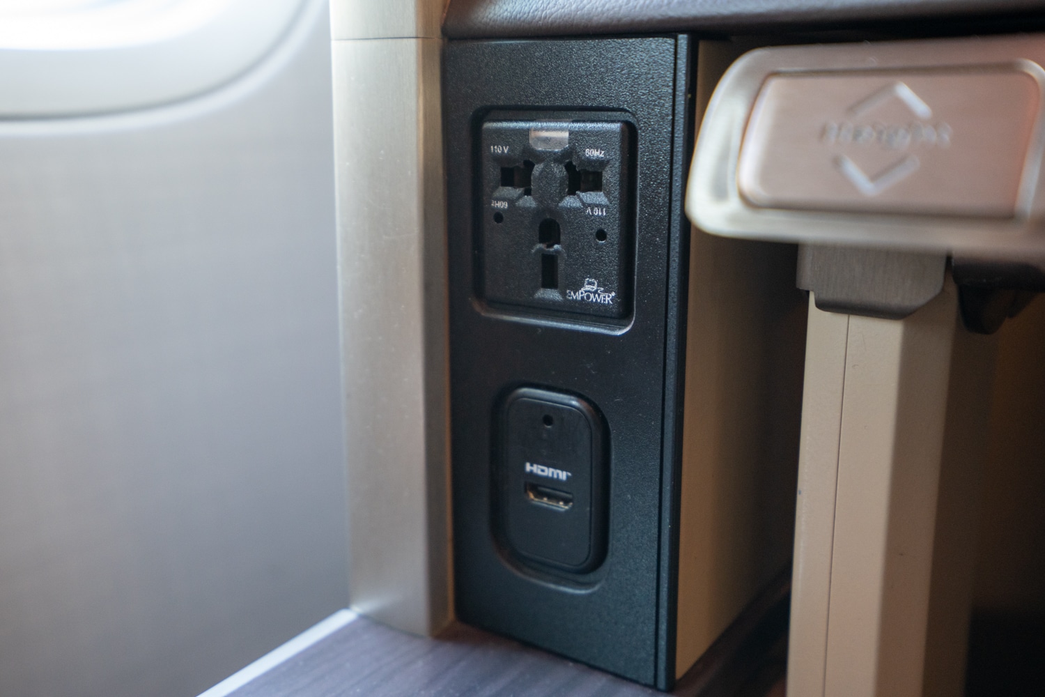 Near the window side, you’ll find a conveniently placed power outlet and HDMI port within easy reach. Additionally, a lever for the tray table is located beneath the in-flight entertainment screen.