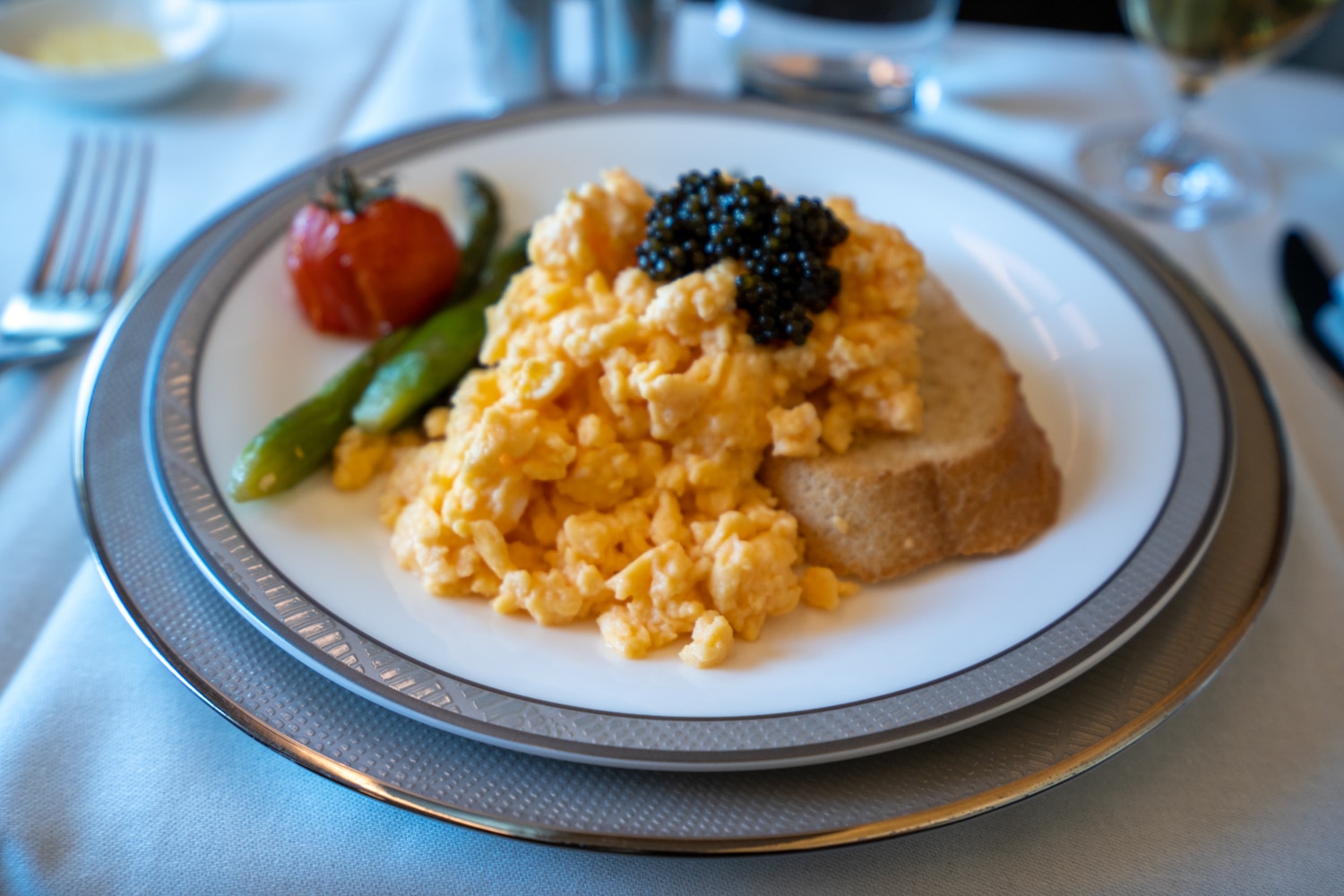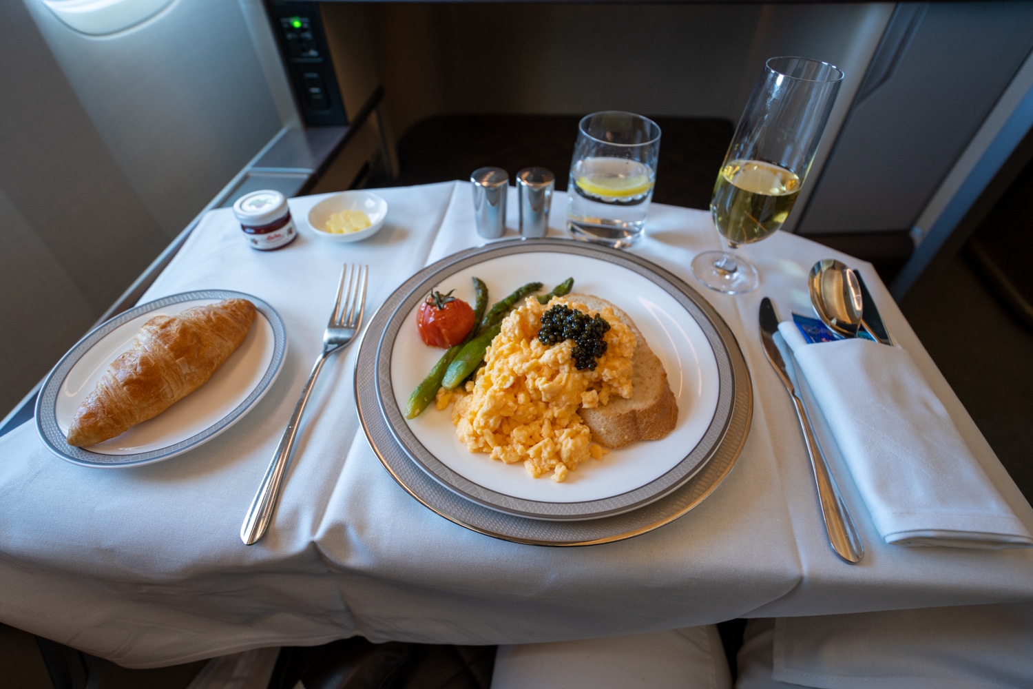 The meal progressed with the arrival of fresh eggs with caviar – one of the standout dishes of the meal. The eggs can be prepared baked, scrambled, or even hard-boiled; however, my preferred soft-poached eggs were not among the options, so I asked for scrambled.