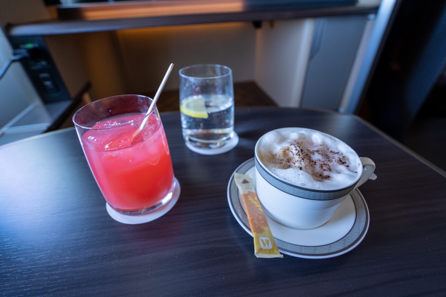Shortly after takeoff, the flight attendant came by to offer me a hot towel and a choice of welcome beverage.