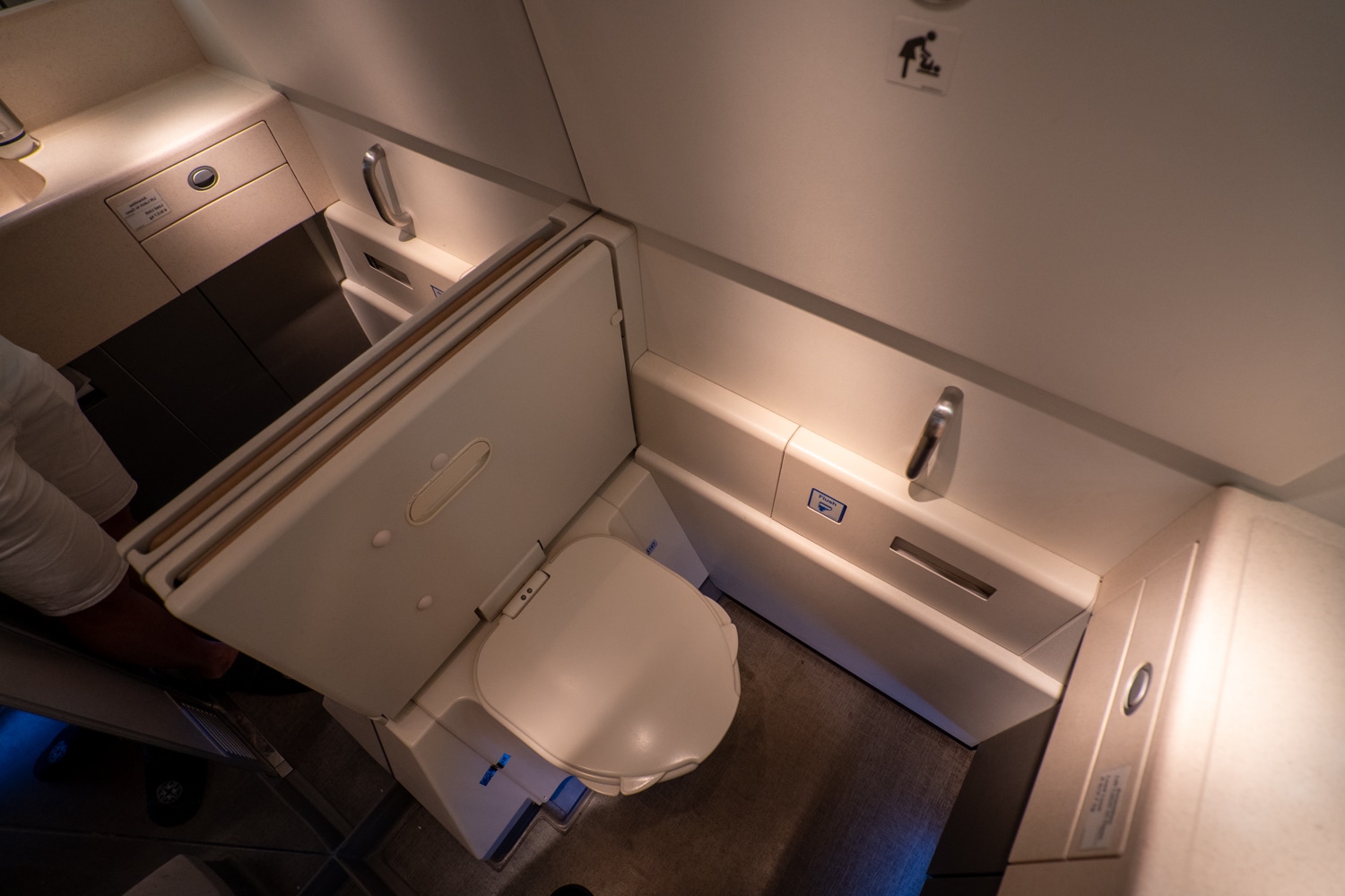 The restroom on board Singapore Airlines was impressive in a simple way, with ample space and a spotless environment.