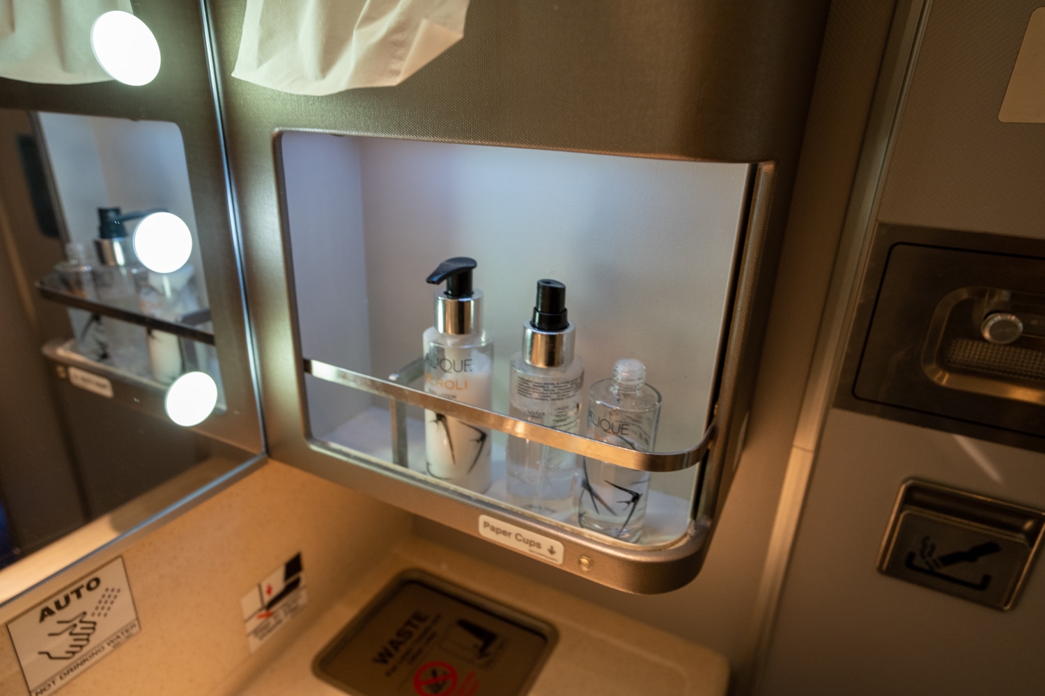 Not only was there a convenient table that folded out from the toilet, providing additional surface space for personal items, but the Lalique amenities also added a luxurious touch.