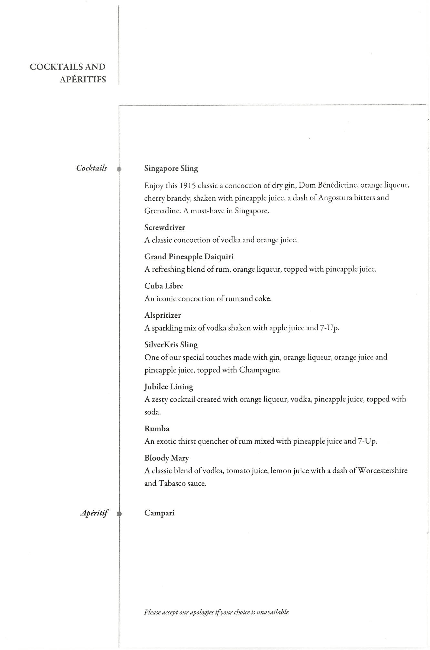 To accompany the meal, I sampled a delightful selection of beverages, including the iconic Singapore Sling, which I had never tried before despite having flown with Singapore Airlines several times.