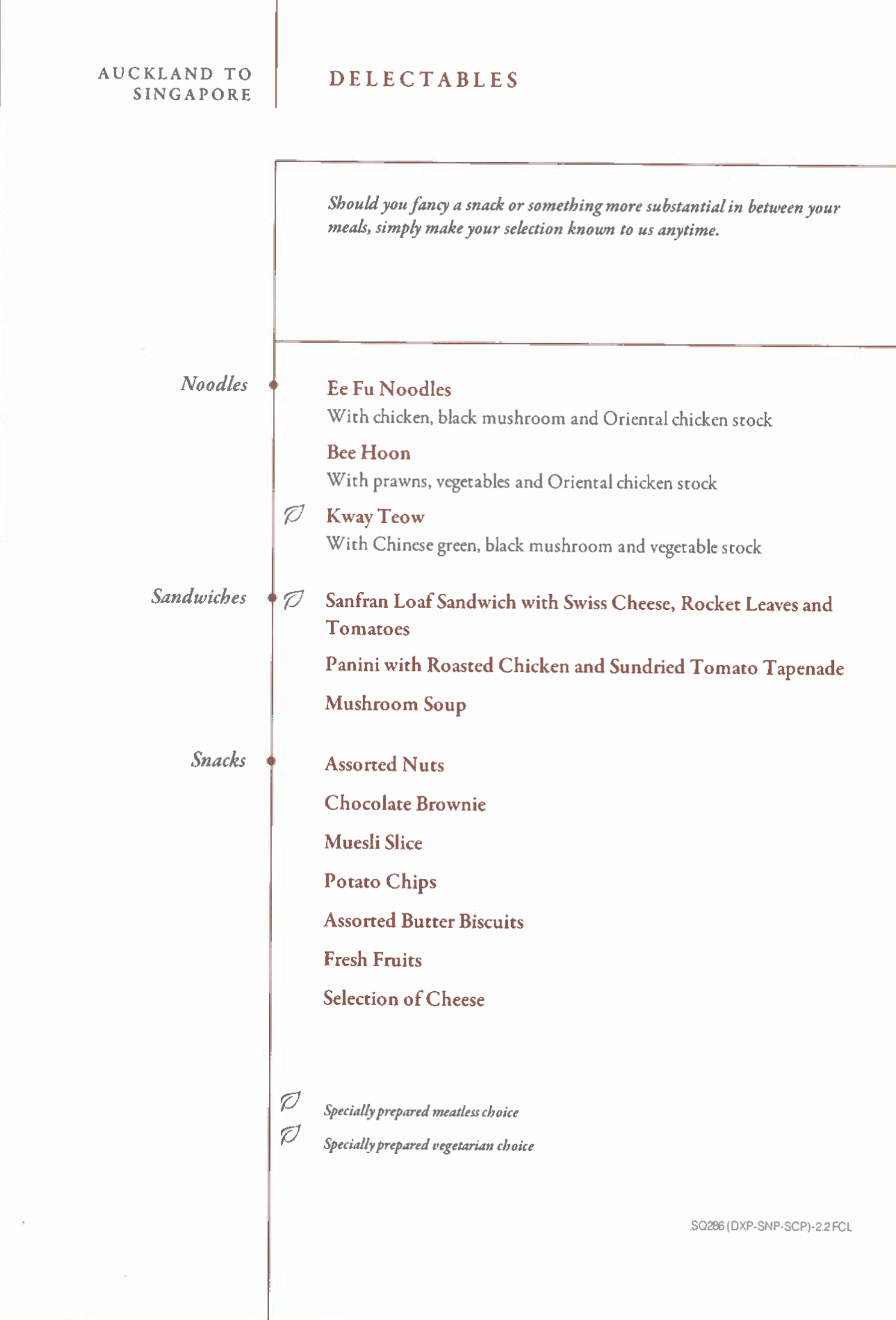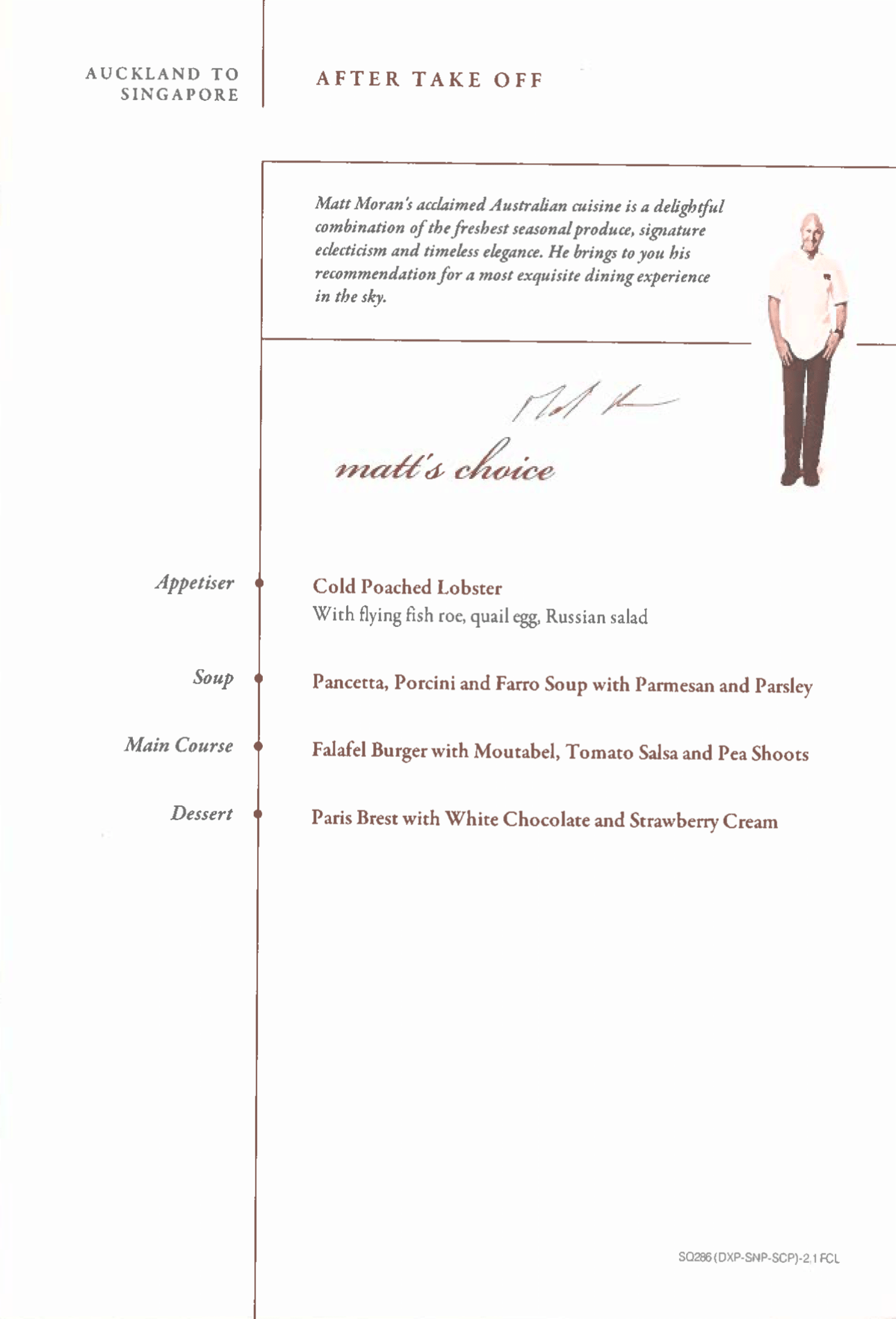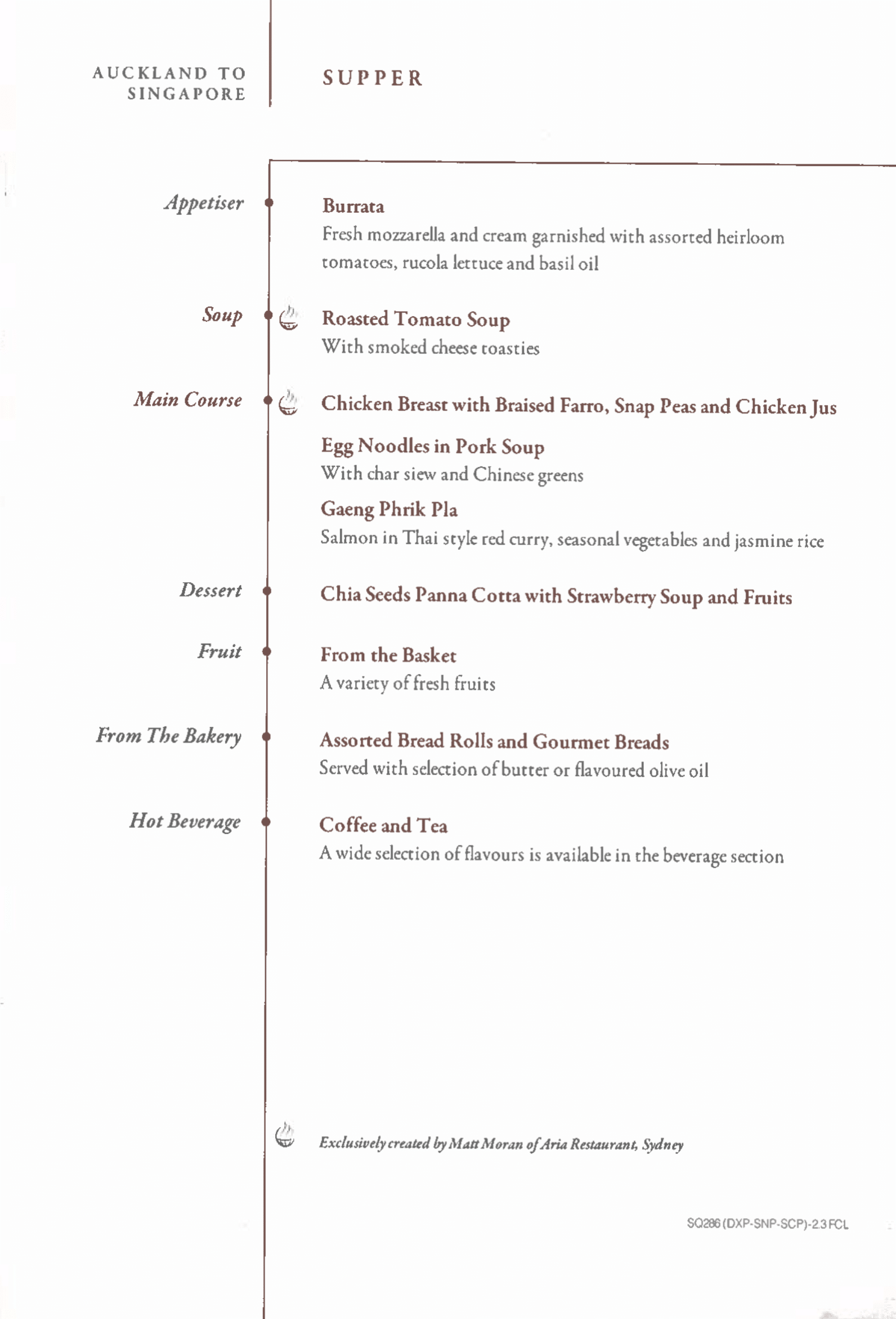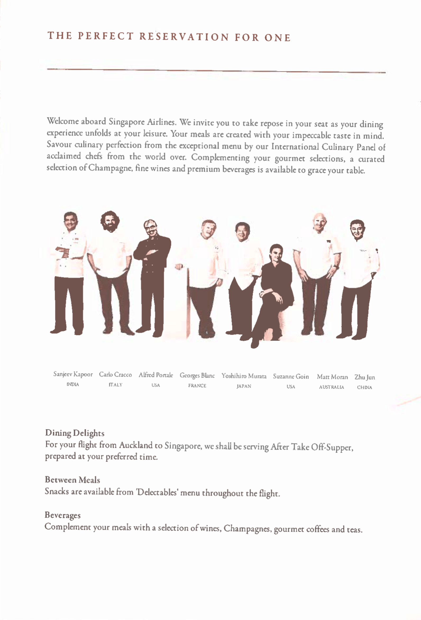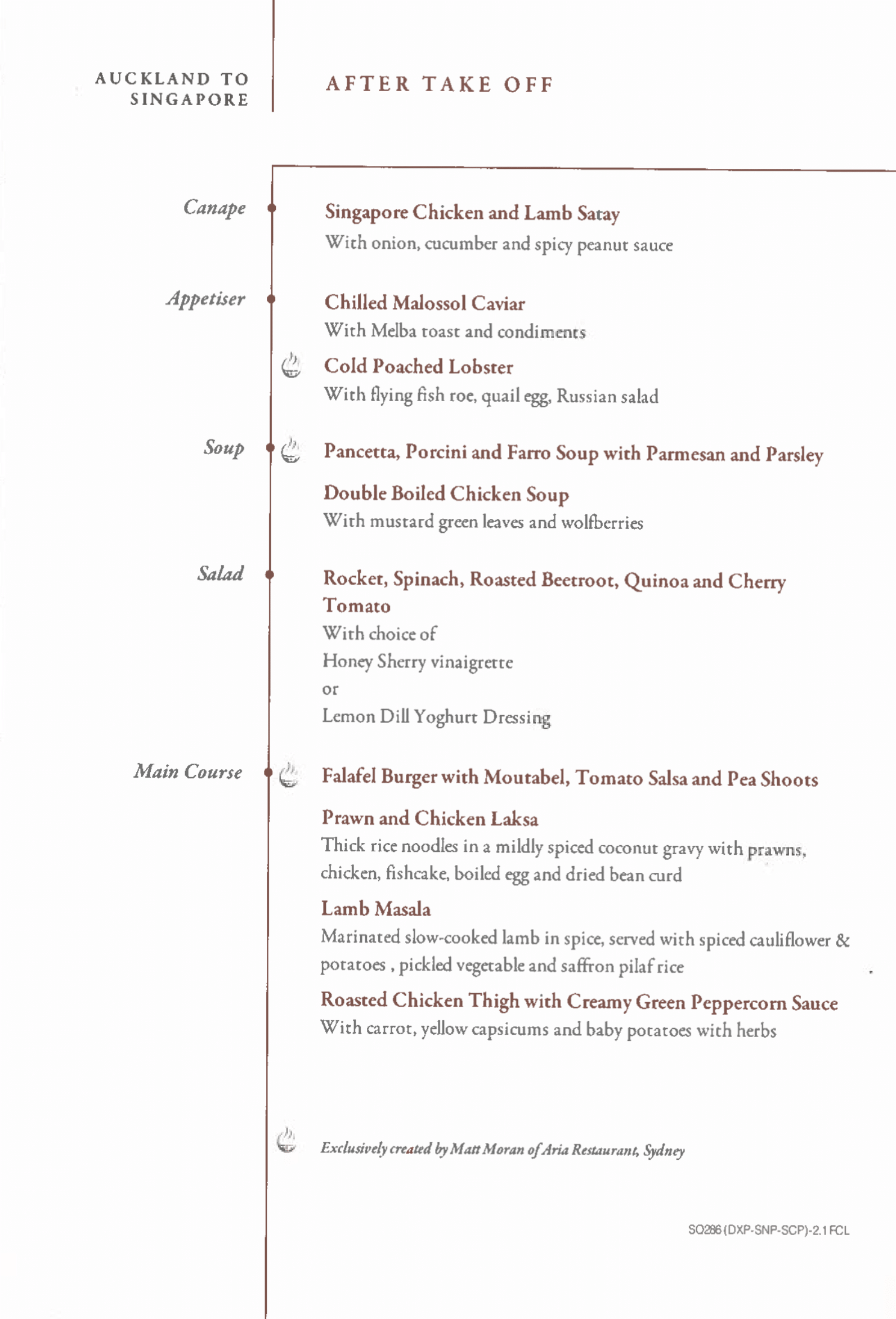 Vivian confirmed with me the meal choices I had made through Singapore Airlines’s Book the Cook service, which allows premium guests to pre-select their meal from an expanded menu before the flight. Lobster Thermidor immediately after takeoff? Check. Grilled New Zealand lamb loin for the supper course? Check.