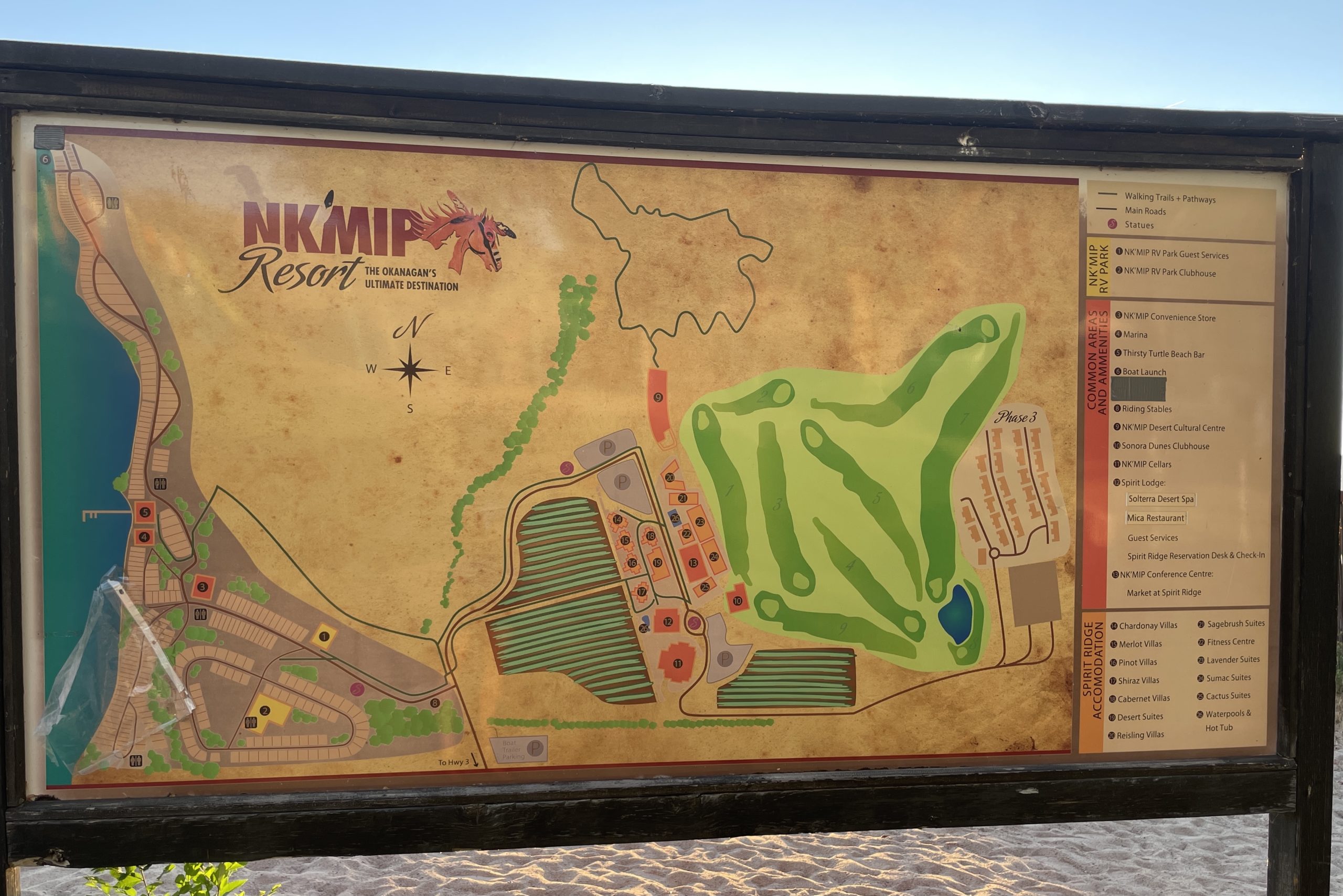 The resort sits on a hillside overlooking Osoyoos Lake, Canada’s warmest lake. It is actually part of a larger resort complex, Nk’Mip Resort, which is located on the land of the Osoyoos Indian Band who owns it. The Nk’Mip Resort also includes a campground, RV park, beach, golf course, winery and cultural centre.