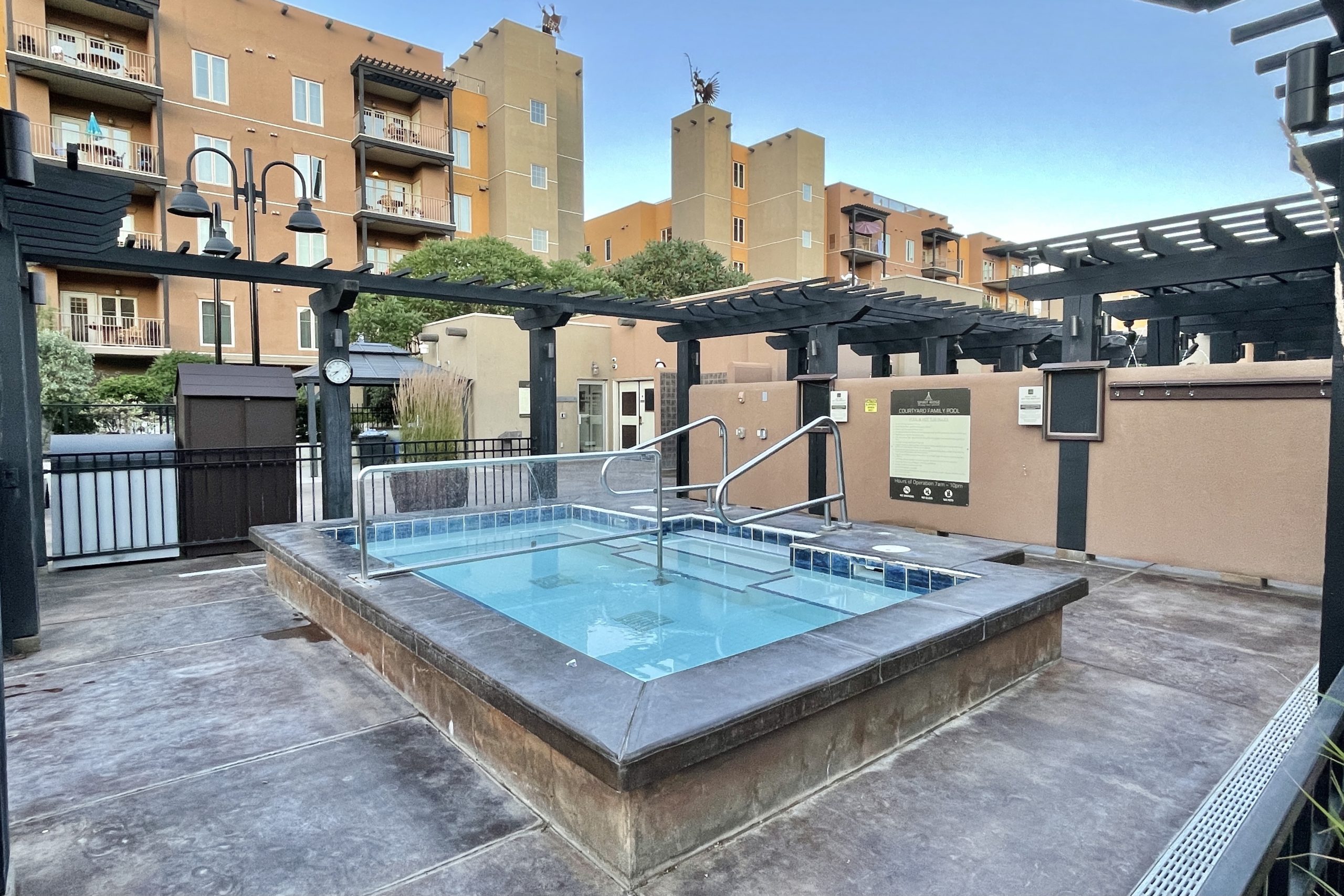 Pools. Spirit Ridge has two outdoor pool areas: the family pool that is open to all ages, and an adult-only pool. Both pools are open from 7am–10pm. The family pool is massive and has a waterslide (which unfortunately was not operational due to the pandemic), a sauna, and a hot tub in the area. It can get busy, especially since we were there during the heatwave.
