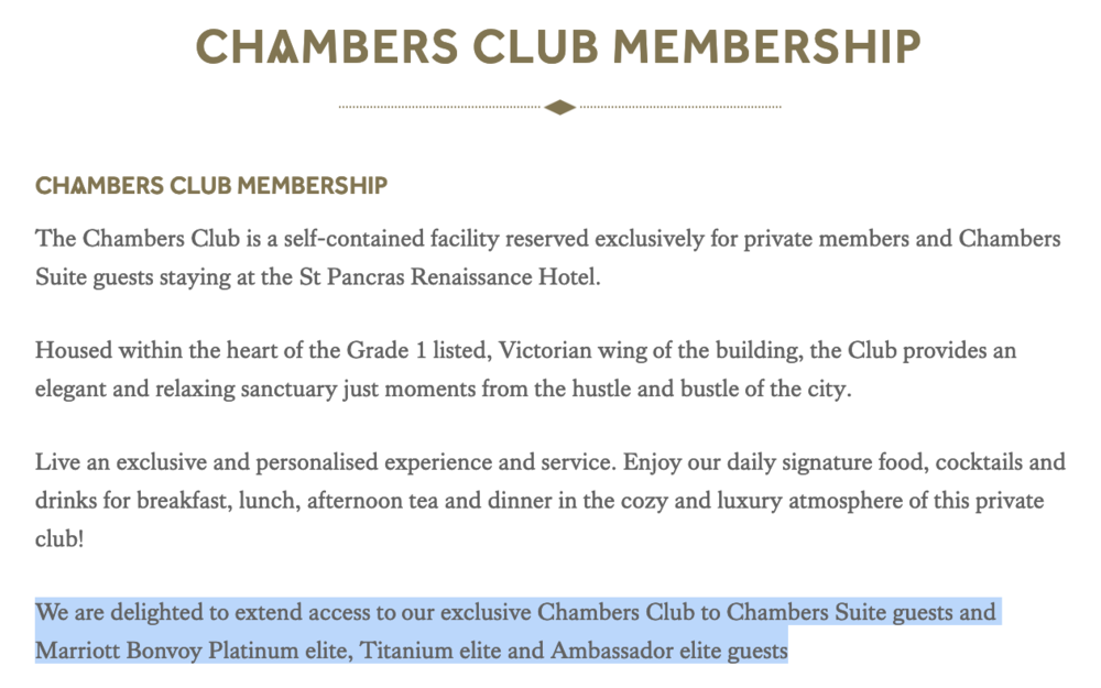 It’s important to note that the St. Pancras Renaissance treats the Chambers Club as a “private club lounge” specifically for its Chambers Wing guests, rather than a regular hotel lounge. This allowed the hotel to circumvent Marriott’s usual treatment of elites, and grant lounge access only to Titanium Elite members or above who aren’t staying in the Chambers Wing, and not to regular Platinum Elite members.