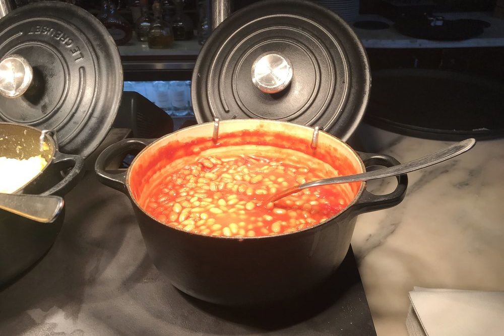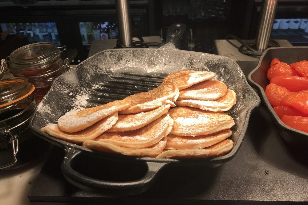 There is a breakfast buffet served along the restaurant’s bar, mostly consisting of the items you’ll find in a traditional English breakfast: scrambled eggs, sausages, bacon, baked beans, mushrooms, and grilled tomatoes. There’s also a variety of pastries, charcuterie, fruits, and juices, as well as a few rotating specialty items like pancakes.
