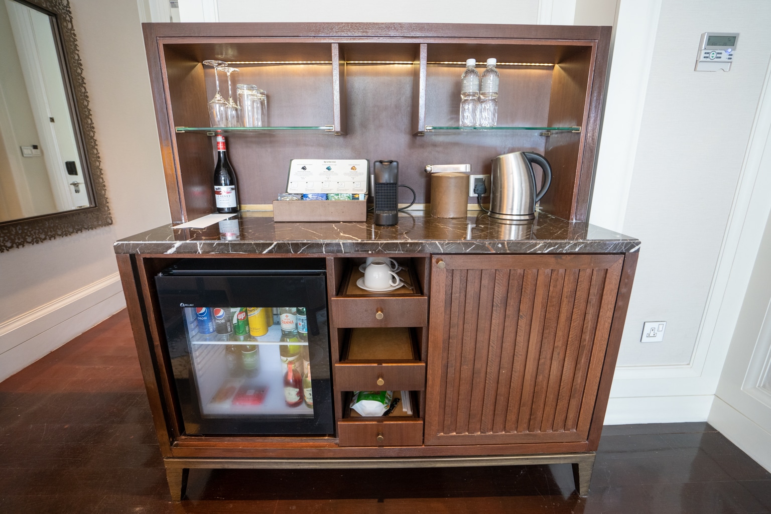 On the left, as you enter the room, there is a well-stocked pantry with a Nespresso coffee machine and tea. Meanwhile, on the right-hand side of the couch is a small bar shelf with liqueurs.