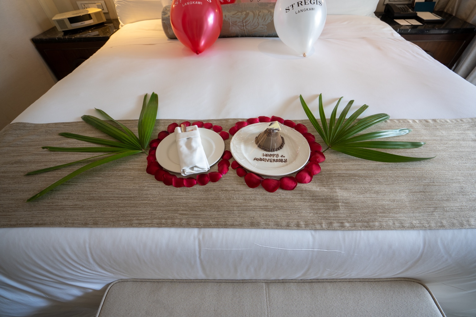 Moving further into the suite, we arrive at the bedroom. The resort had proactively decorated the room for our anniversary, which I appreciated as a thoughtful touch.