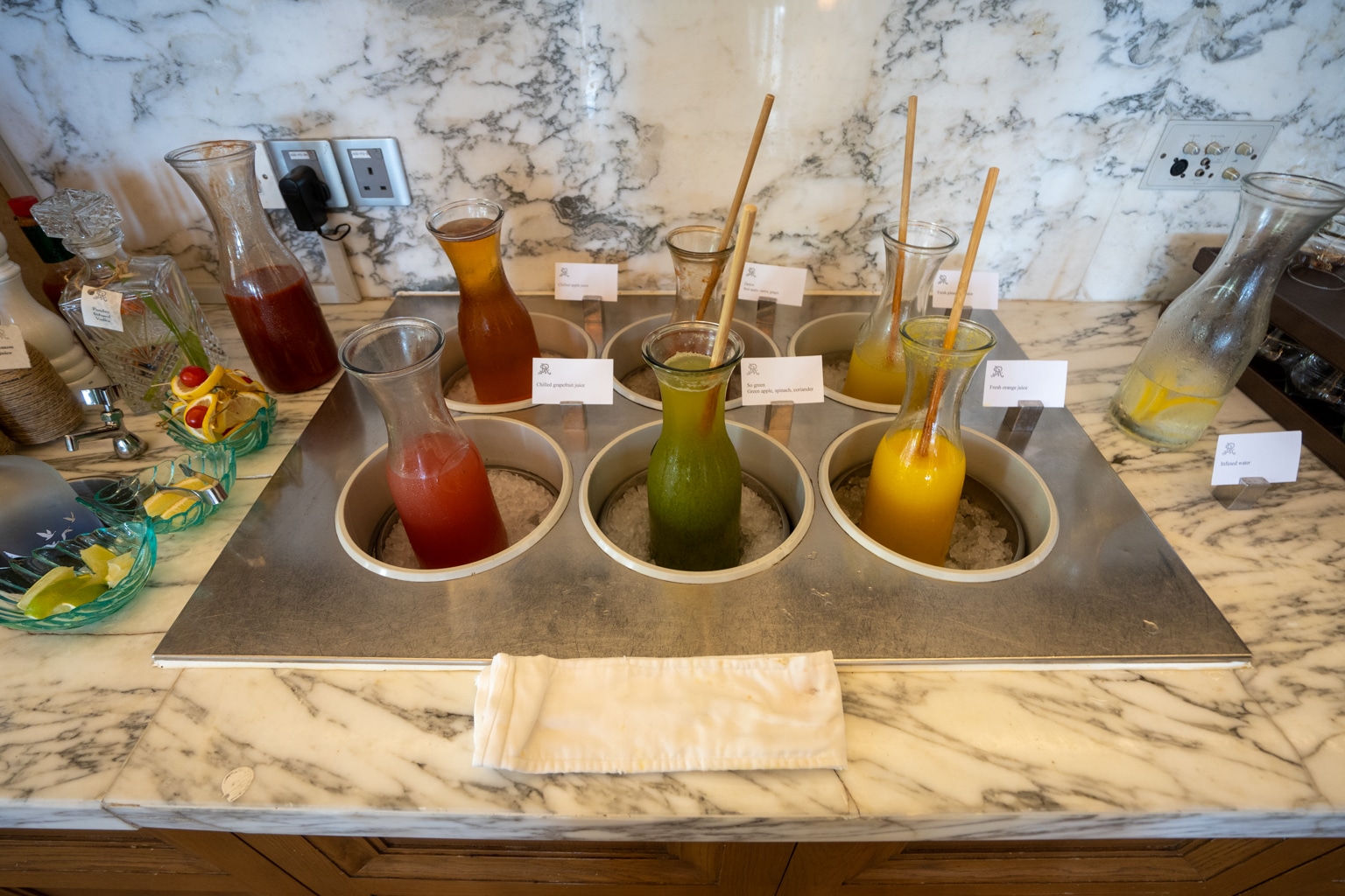In addition, an extensive drinks list is available, such as specialty coffee and tea, St. Regis iced tea, and sparkling wine. In the past, Champagne had been served here at the breakfast spread, but now the standard is sparkling wine, which can be mixed with orange juice to make mimosas.