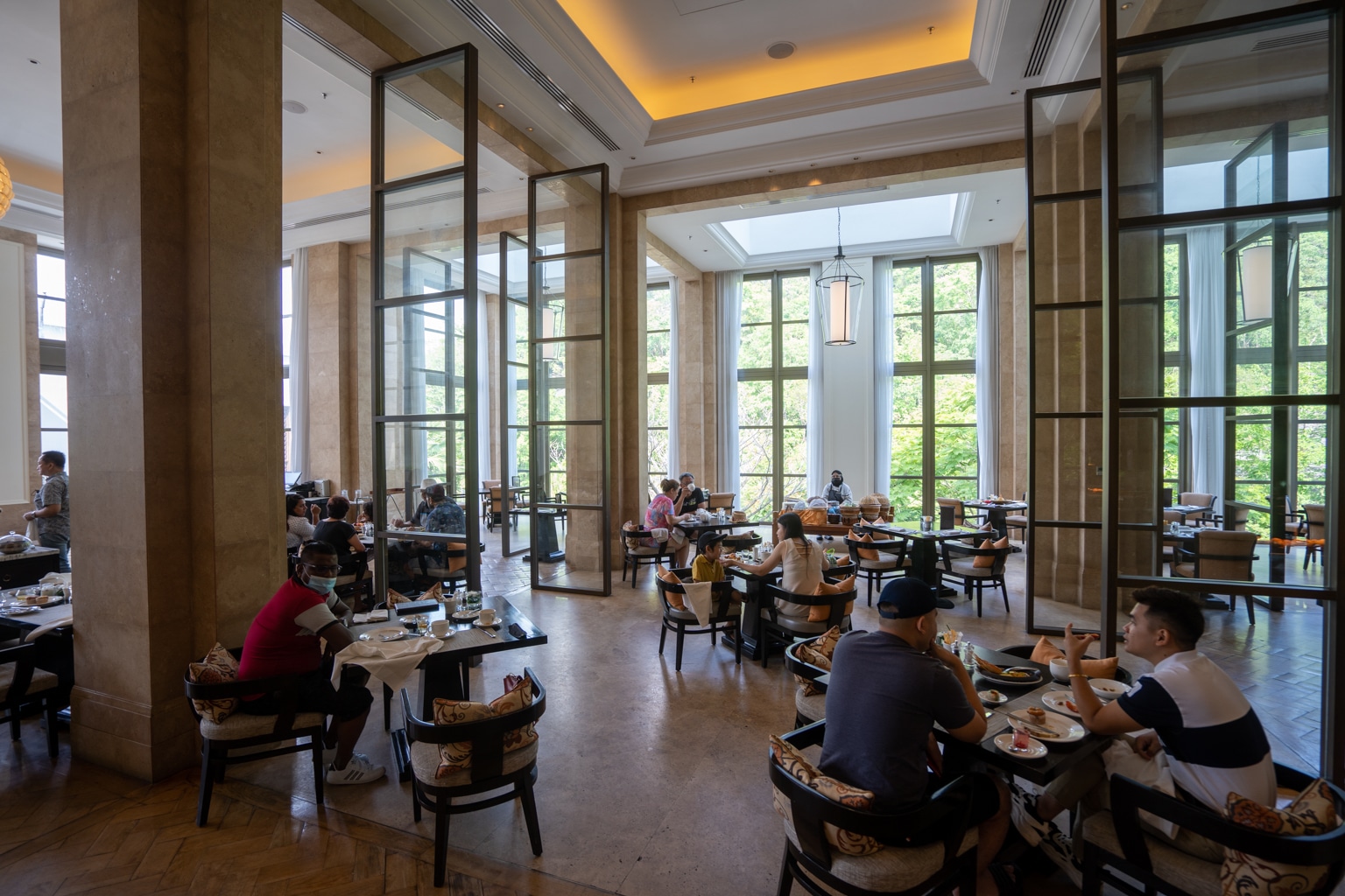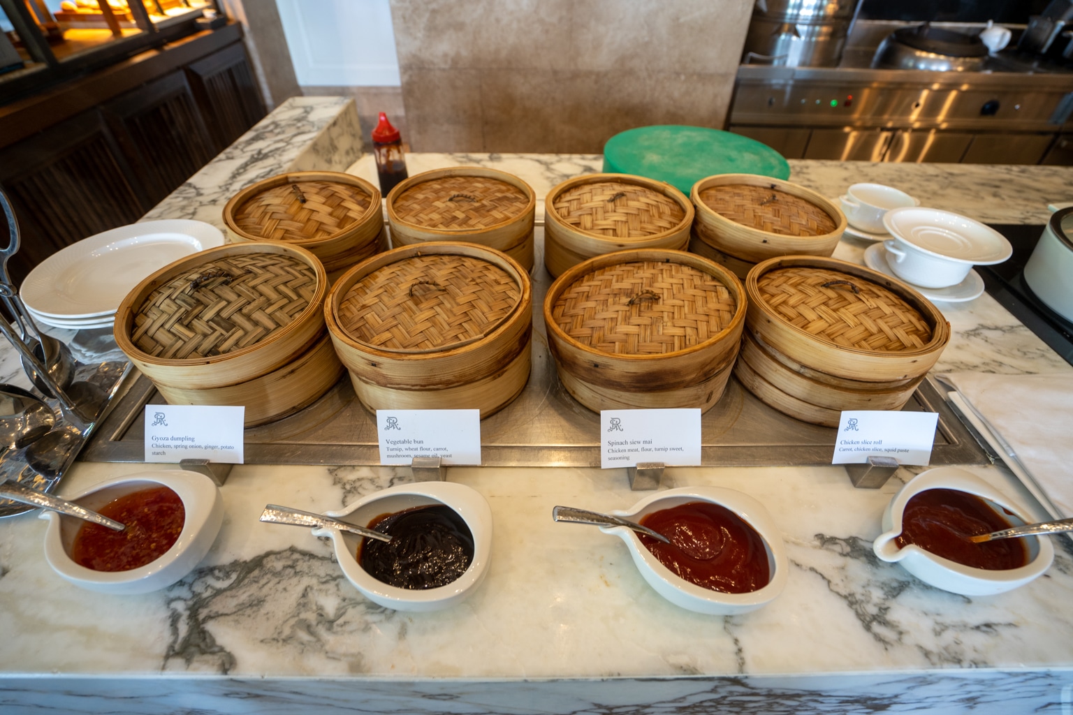 The à la carte menu features items such as river lobster omelette, steak and eggs, and wonton noodles. Meanwhile, the extremely wide-ranging and impressively presented buffet consists of all the typical Western breakfast items, along with an abundance of Chinese-, Malaysian-, and Indian-inspired items.