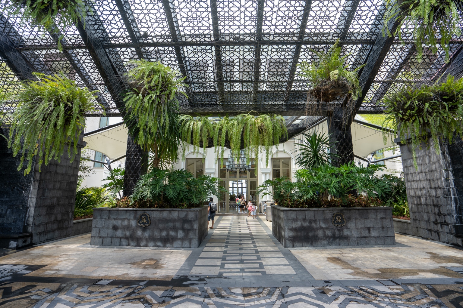 The grounds feature Islamic arches and mashrabiya-inspired architecture, and the outdoor layout draws upon a series of large central courtyards.