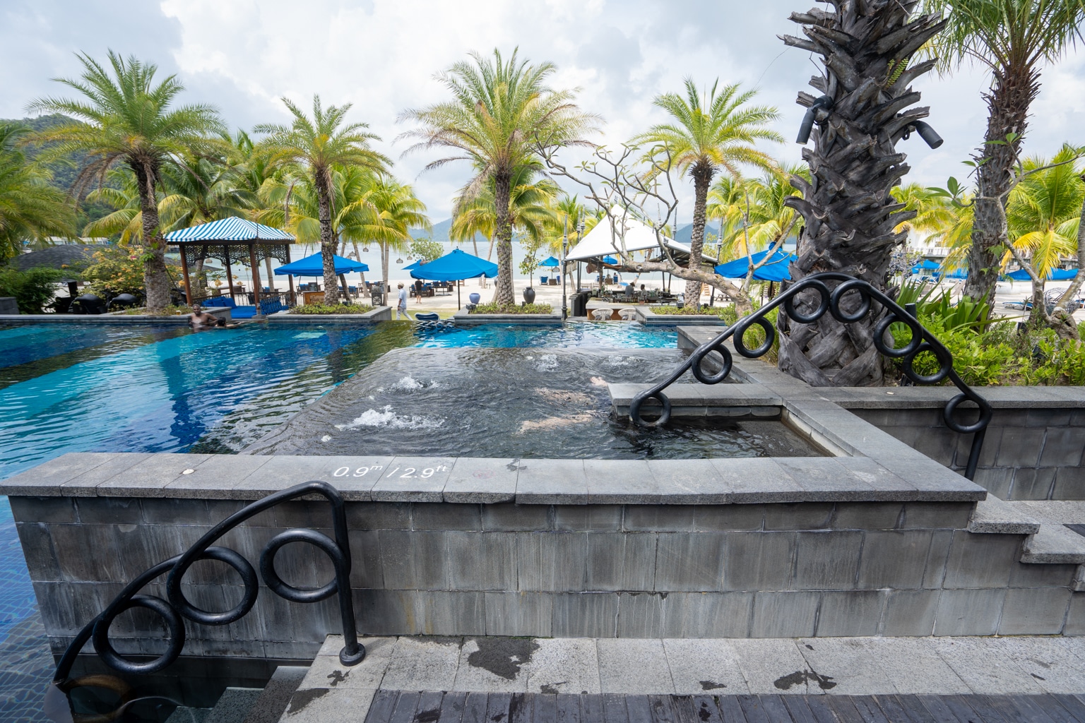 The resort has a central pool area, consisting of an entire swimming pool “complex” with a series of cascading infinity pools.