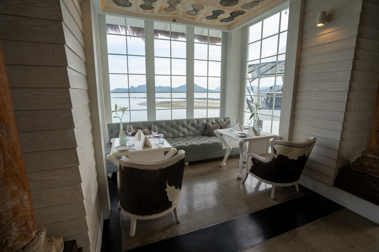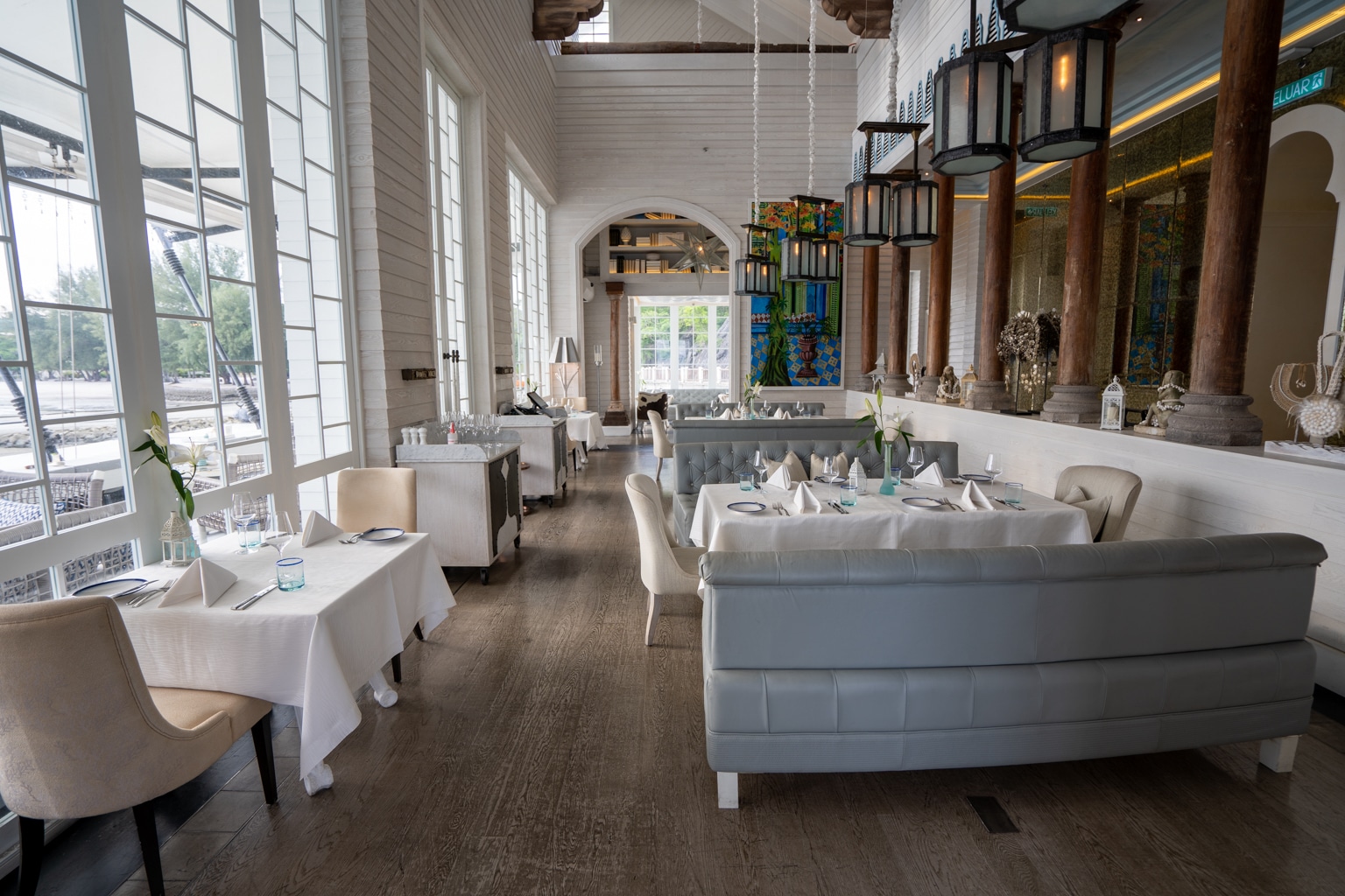 This overwater restaurant was built to resemble an art collector’s beach house, and offers some incredible sunset views from the outdoor patio.